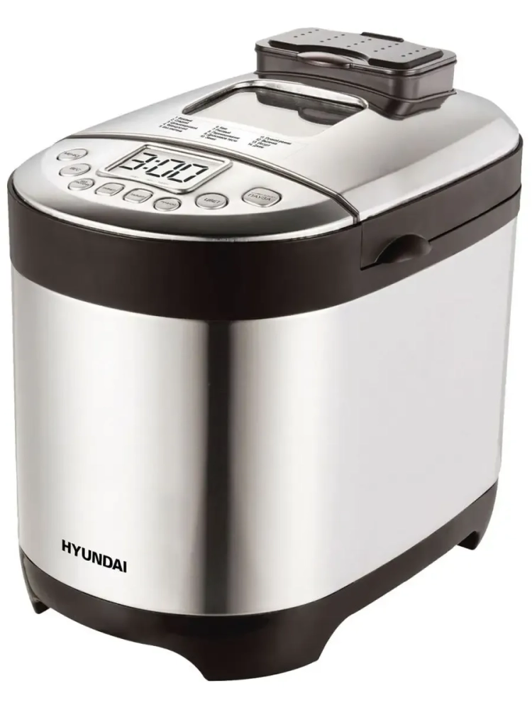 Хлебопечь Hyundai HYBM-4081 черный/серебристый, мощность 550Вт, вес выпечки до 1000г, программ приготовления: 14 Диспенсер для автоматического добавление ингредиентов Мерный стакан, мерная ложка, лопасть для замешивания теста, крюк для извлечения лопасти.