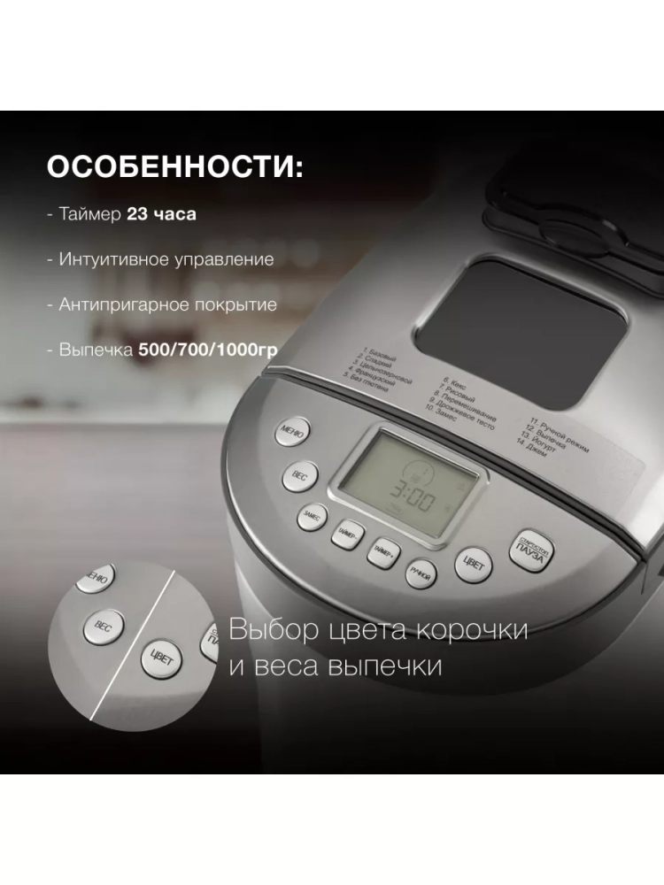 Выпечка под индивидуальные предпочтения: Имеется возможность выбора размера выпечки (500, 700,1000 г) и цвета корочки, что позволяет приготовить хлеб, идеально соответствующий вкусам и потребностям.