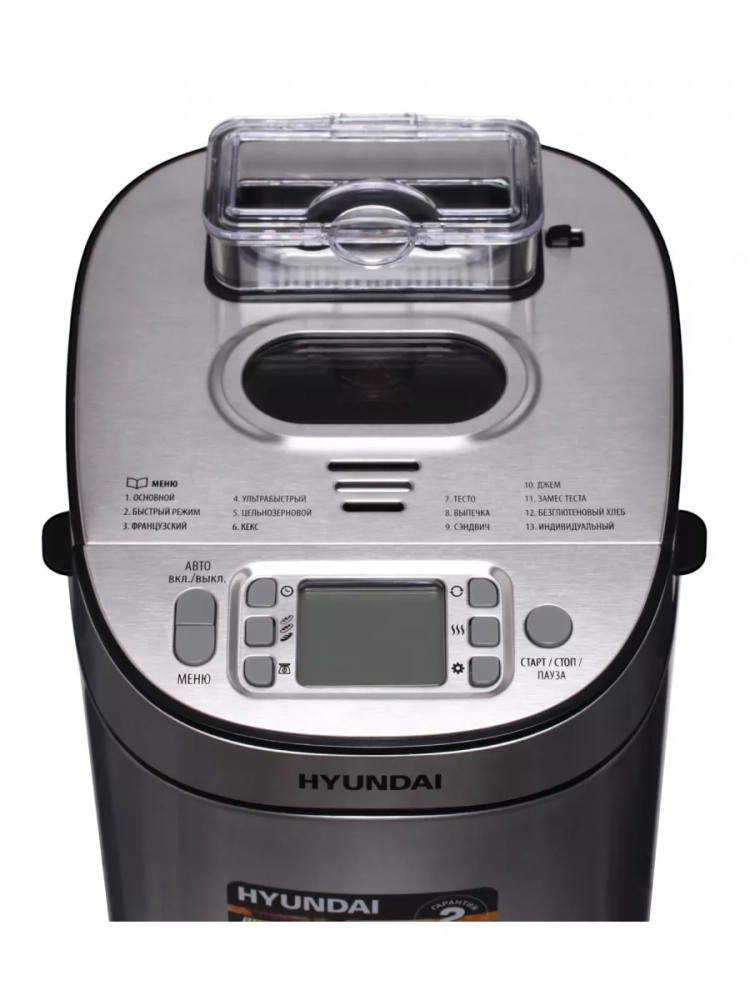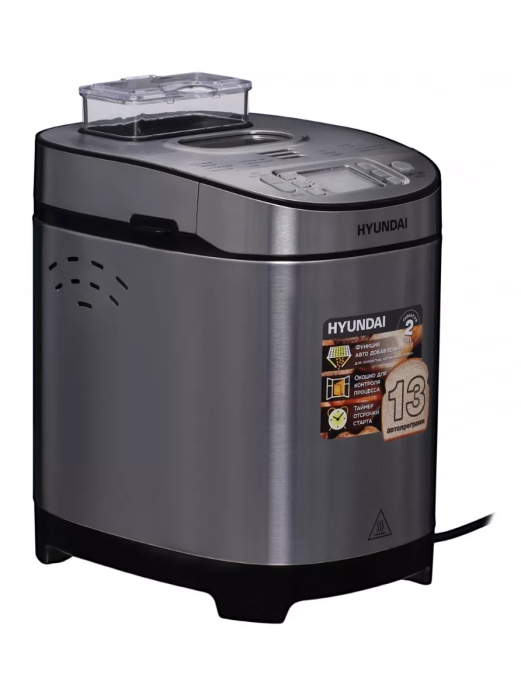 Хлебопечь Hyundai HYBM-M0313G серебристый/черный, мощность 600Вт, вес выпечки до 900г, форма выпечки буханка, программ приготовления: 13. размер корзины для хлеба 13,5х13,5х15,6 см. Книга рецептов, Мерный стакан, мерная ложка, лопасть для замешивания теста, крюк для извлечения лопасти