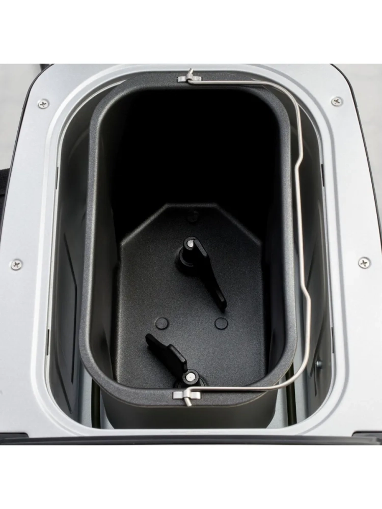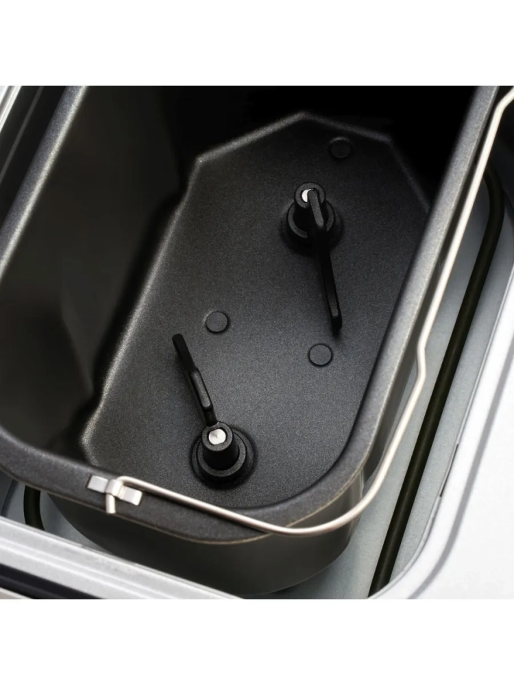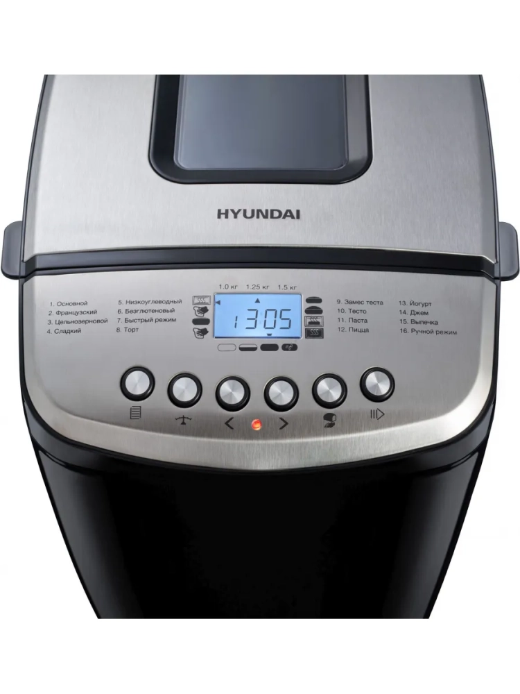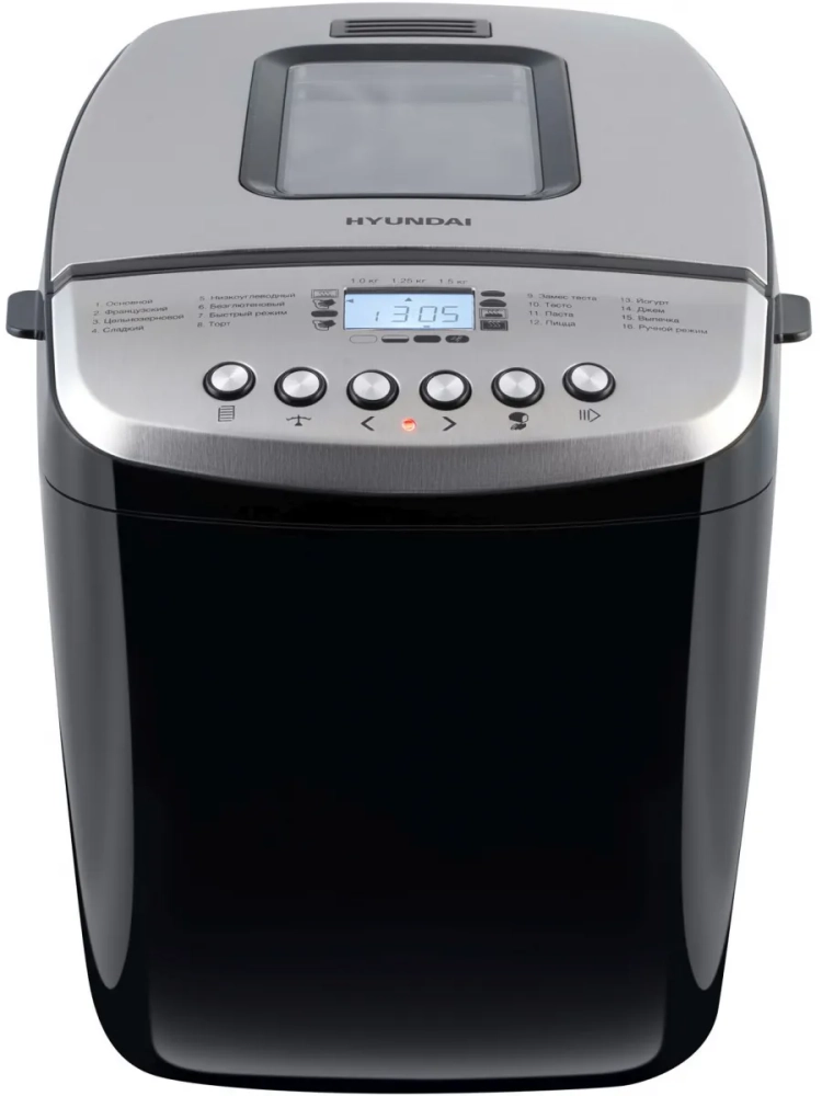 Хлебопечь Hyundai HYBM-P0412 черный/серебристый, мощность 850Вт, вес выпечки до 1500г, форма выпечки буханка, программ приготовления: 16.Приятная белая подсветка дисплея. 2 лопасти для равномерного замеса теста большой выпечки. размер корзины для хлеба 22х12,4х15,3 cm
