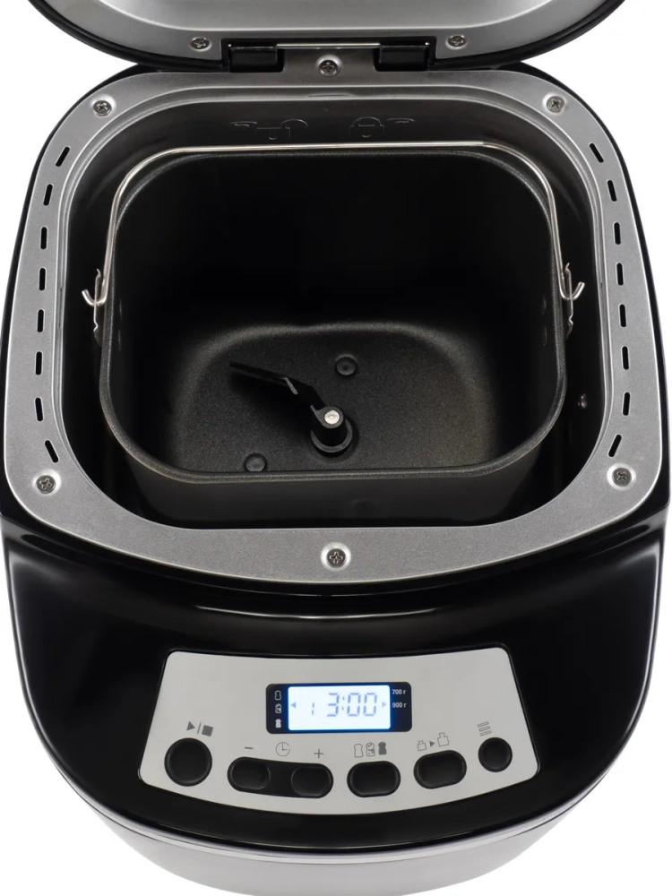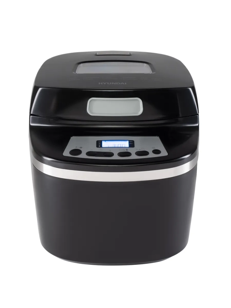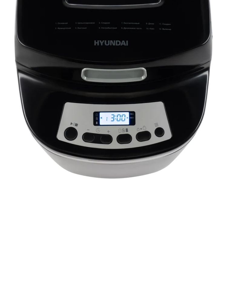 Хлебопечь Hyundai HYBM-P0613 черный/серебристый, мощность 600Вт, вес выпечки до 900г, форма выпечки буханка, программ приготовления: 12.Сниженный уровень шума 55дБ, компактнее на 15%, форму для запекания можно мыть в посудомойке, голубая подсветка дисплея.антипригарное покрытие формы, окно контроля процесса.