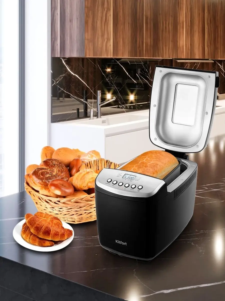 Хлебопечка Kitfort КТ-309 — это идеальное решение для любителей домашней выпечки. С её помощью вы сможете приготовить разнообразные виды хлеба, джемы и кексы, а также замесить тесто для пирогов или пиццы. Эта хлебопечь оснащена 16 автоматическими программами, которые позволяют легко справиться с приготовлением ржаного хлеба, сдобы и десертов. Корпус устройства выполнен из прочного пластика, а прозрачное окно в верхней крышке позволяет наблюдать за процессом приготовления. Одной из ключевых особенностей этой модели является функция отложенного старта и ускоренной выпечки. Вы можете выбрать вес готового продукта и цвет корочки в соответствии с вашими предпочтениями. В процессе приготовления можно добавить дополнительные ингредиенты в тесто — прибор своевременно оповестит вас об этом звуковым сигналом. Эта автоматическая хлебопечь обладает энергонезависимой памятью: при отключении электропитания настройки сохраняются на 10 минут, что позволяет продолжить программу после восстановления питания без потери данных. Если же питание отсутствует более 10 минут, настройки сбрасываются. Функция поддержания температуры обеспечивает сохранение свежести и тепла готовой выпечки на протяжении одного часа после завершения программы. Хлебопечка Kitfort КТ-309 станет незаменимым помощником на вашей кухне благодаря своей многофункциональности и простоте использования. В комплекте идет чаша в хлебопеч для замеса теста объёмом 3.8 литра и форма для выпекания в печке различных рецептов.