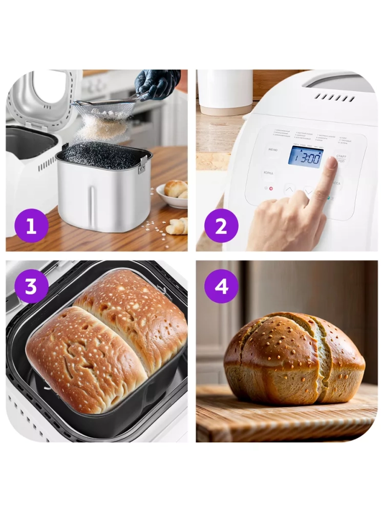 Функция поддержания температуры готовых блюд сохраняет выпечку свежей и горячей в течение одного часа после завершения работы любой программы.