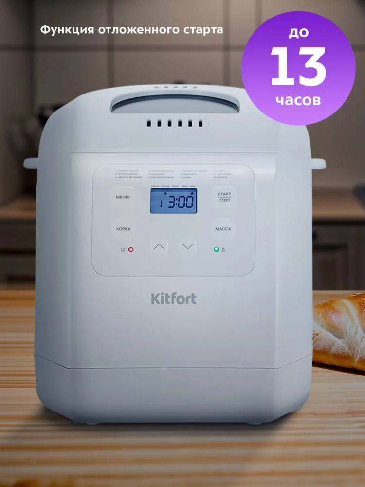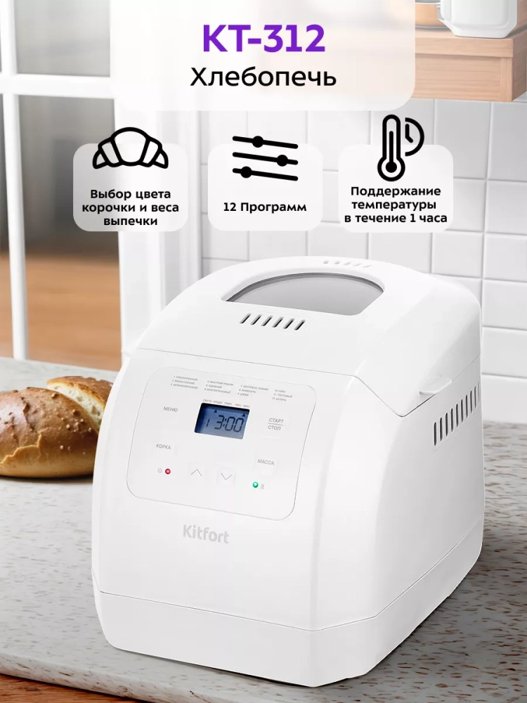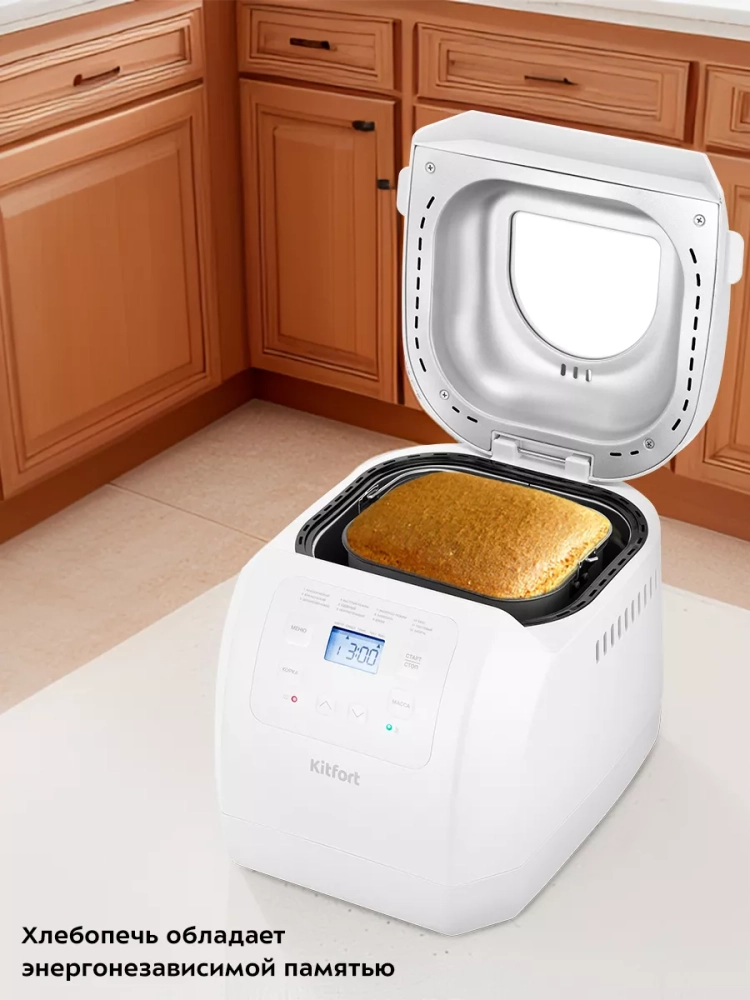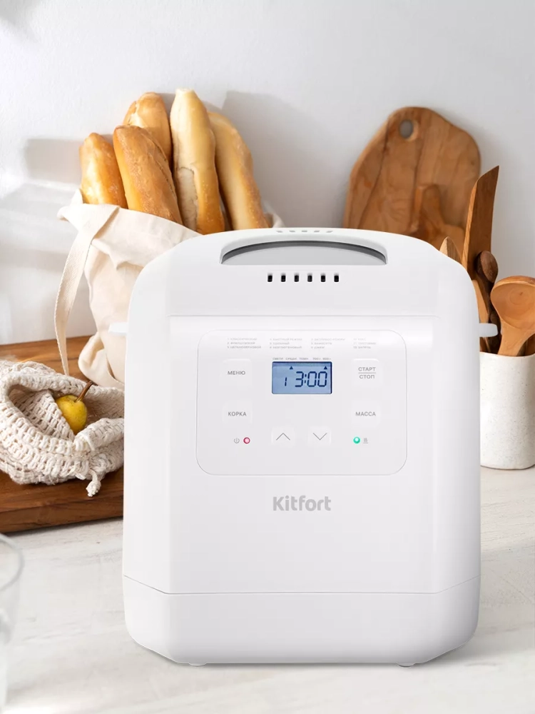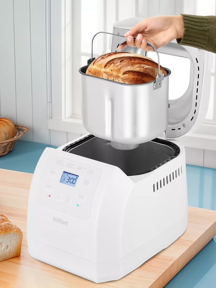 Хлебопечь Kitfort КТ-312 позволяет готовить различные виды хлеба, джем и кексы, а также тесто. Корпус прибора сделан из пластика. В крышке есть прозрачное окно, через которое можно наблюдать за процессом приготовления.
