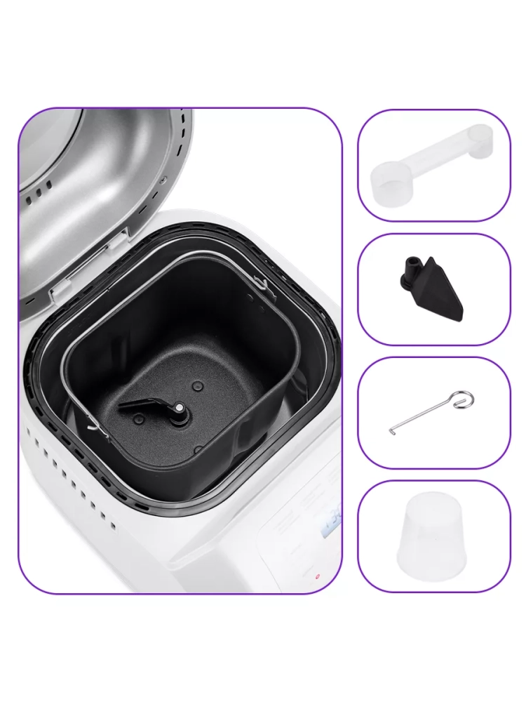 С помощью 12 автоматических программ вы легко приготовите вкусную домашнюю выпечку, ржаной хлеб, сдобу, джем или десерты, замесите тесто для пирогов и пиццы. Вы можете начать приготовление в более позднее время, используя функцию отложенного старта, или, наоборот, воспользоваться программой ускоренной выпечки. У прибора есть функцией выбора веса готового продукта и цвета корочки в соответствии с вашими вкусовыми предпочтениями. Во время приготовления вы можете добавить в тесто дополнительные ингредиенты, например цукаты или орехи. Об этом в нужное время прибор сообщит звуковым сигналом.