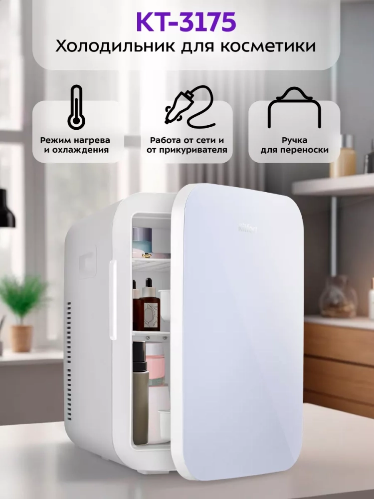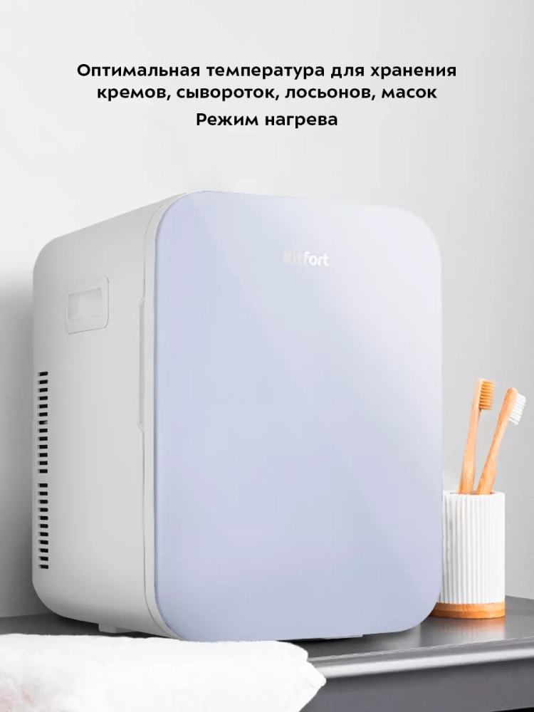 В холодильнике для косметики Kitfort KT-3175 поддерживается оптимальная температура для хранения косметических средств: кремов, сывороток, лосьонов, масок. Также у устройства есть режим нагрева, который подойдет, например, для разогрева восковых полосок, специальных масел или масок перед их использованием.