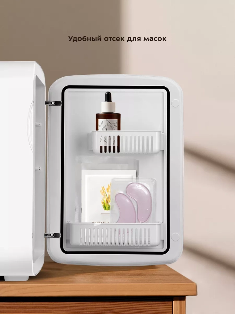 Благодаря наличию сетевого и автомобильного шнура в комплекте вы можете использовать холодильник дома или взять его в поездку на машине. Полки холодильной камеры и дверные полки позволят рассортировать косметику.