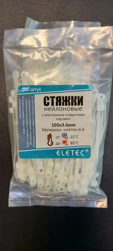 Хомут нейлоновый Eletec 100х3,6 бесцветный, с отверстием (100 шт).