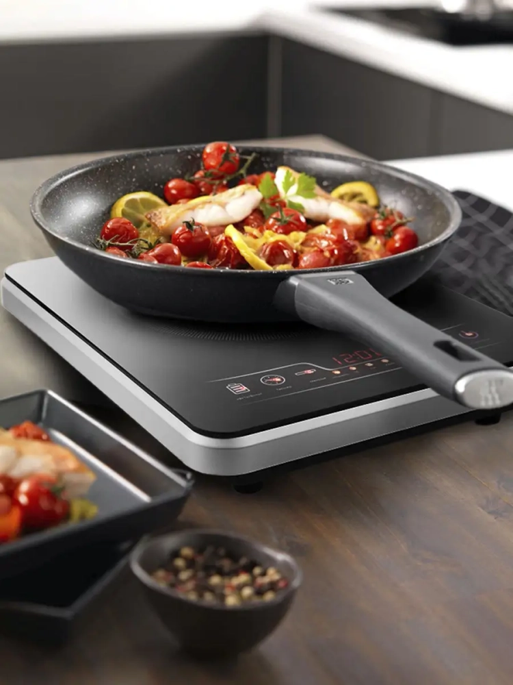 При использовании сковородок большого диаметра желательно, чтобы они имели толстое дно для равномерного распределения тепла. Зона нагрева ограничивается диаметром индуктора, который составляет приблизительно 17 см.