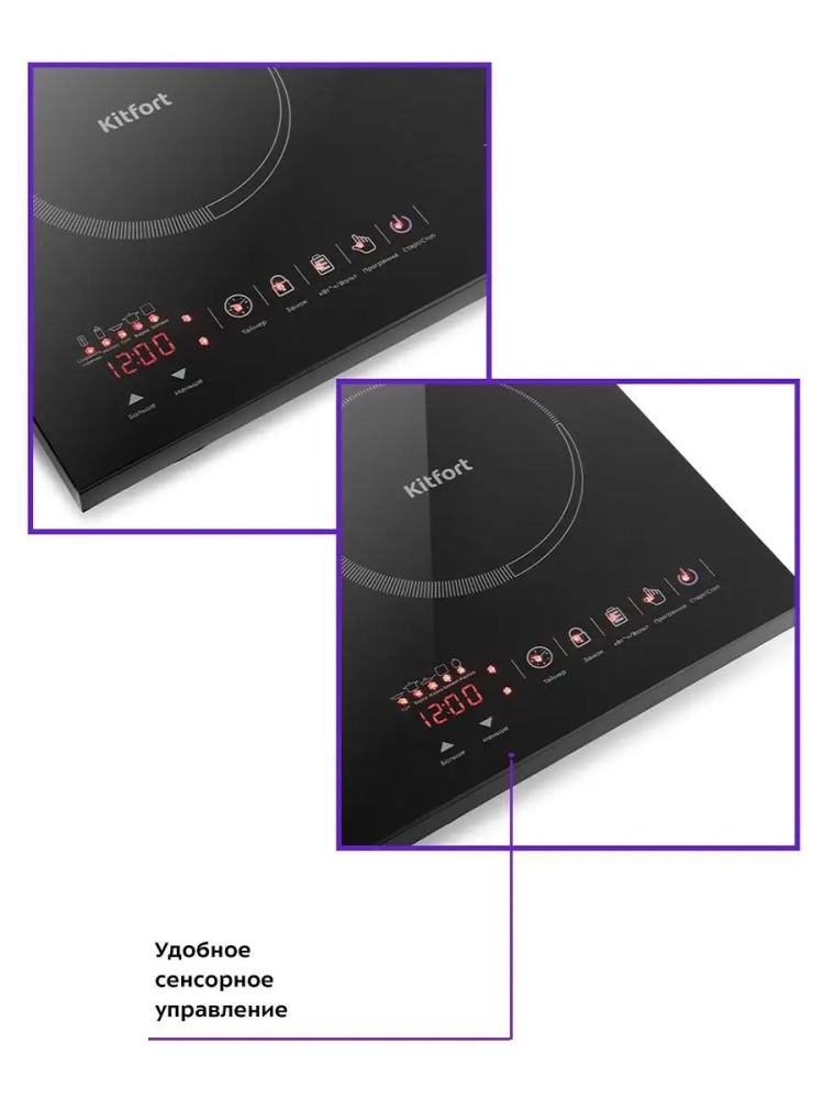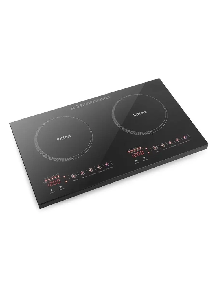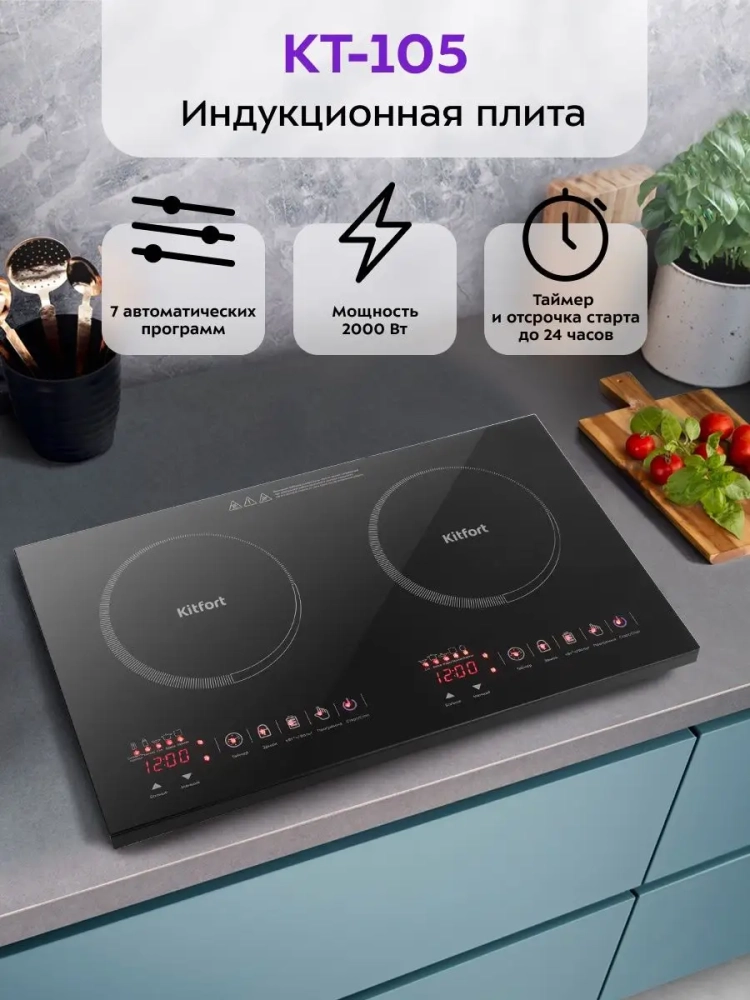Индукционная плита Kitfort КТ-105 представляет собой один из новых экологически чистых кухонных приборов, разработанных по новейшим европейским, американским и японским технологиям. За короткое время с момента включения до начала кипения КПД нагрева может достигнуть 94 %. Индукционная плита Kitfort КТ-105 имеет защиту от перегрева. Для индукционной плиты подходит посуда с дном из ферромагнитных материалов: стальная, чугунная, эмалированная посуда, посуда из нержавеющей стали, а также любая другая, предназначенная для индукционного нагрева (обычно такая посуда имеет специальную маркировку). Рекомендуемый диаметр дна составляет 12-26 см, хотя возможно использовать посуду и других диаметров, вплоть до 7 см. Если посуда не подходит для индукционной плиты или диаметр дна слишком мал, то на дисплее отобразится код ошибки E8, и нагрев осуществляться не будет. Плита КТ-105 выдерживает вес не более 10 кг на конфорку и не более 20 кг суммарно.