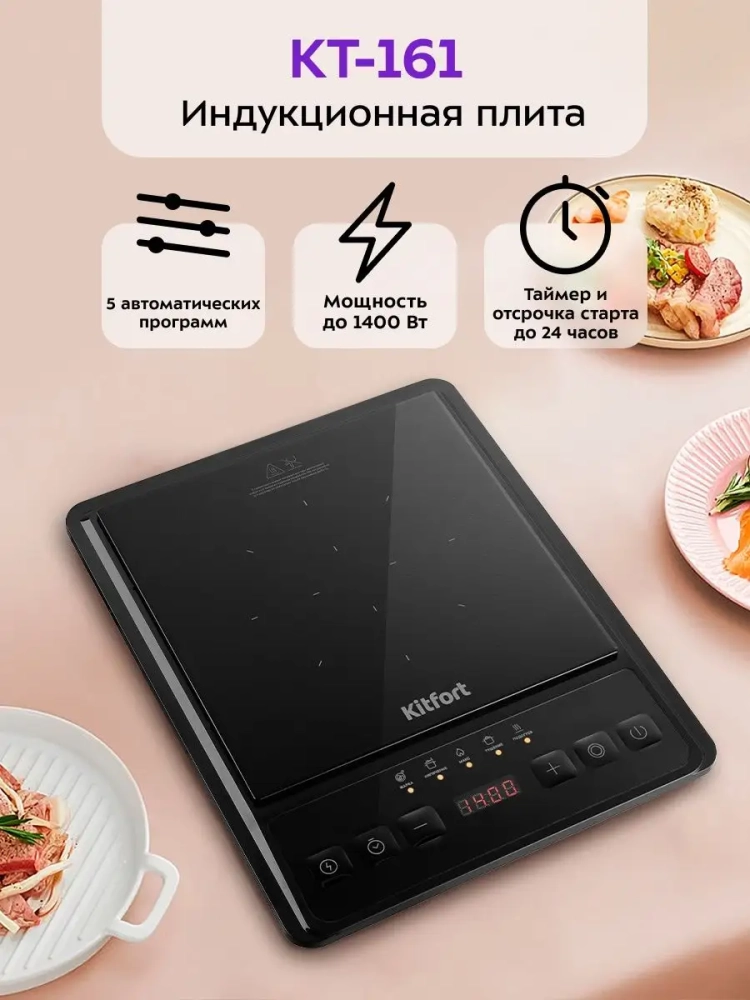 Плита Китфорт КТ-161 выполнена в пластиковом корпусе с рабочей поверхностью из стеклокерамики и обладает максимальной мощностью 1400 Вт. На низких уровнях мощности регулировка мощности осуществляется плавнее, чем у обычных плит, а импульсно-периодический режим включается только на уровнях менее 1000 Вт.