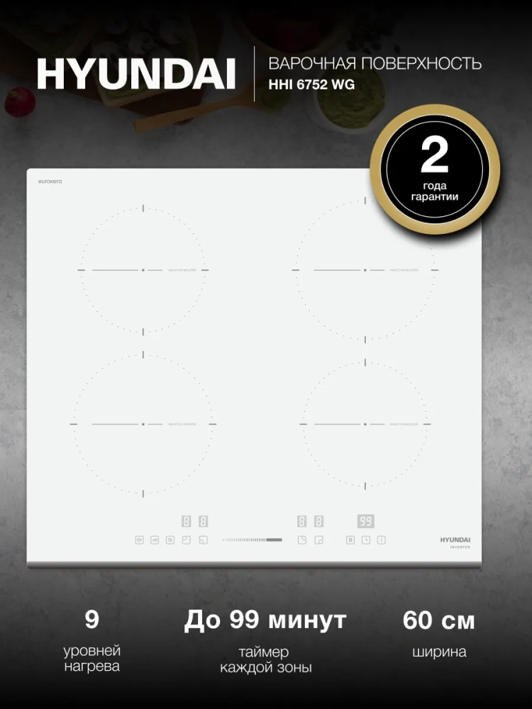 Индукционная варочная поверхность Hyundai HHI 6752 WG белый, материал поверхности стеклокерамика.Тип переключателей:сенсорные/слайдерные