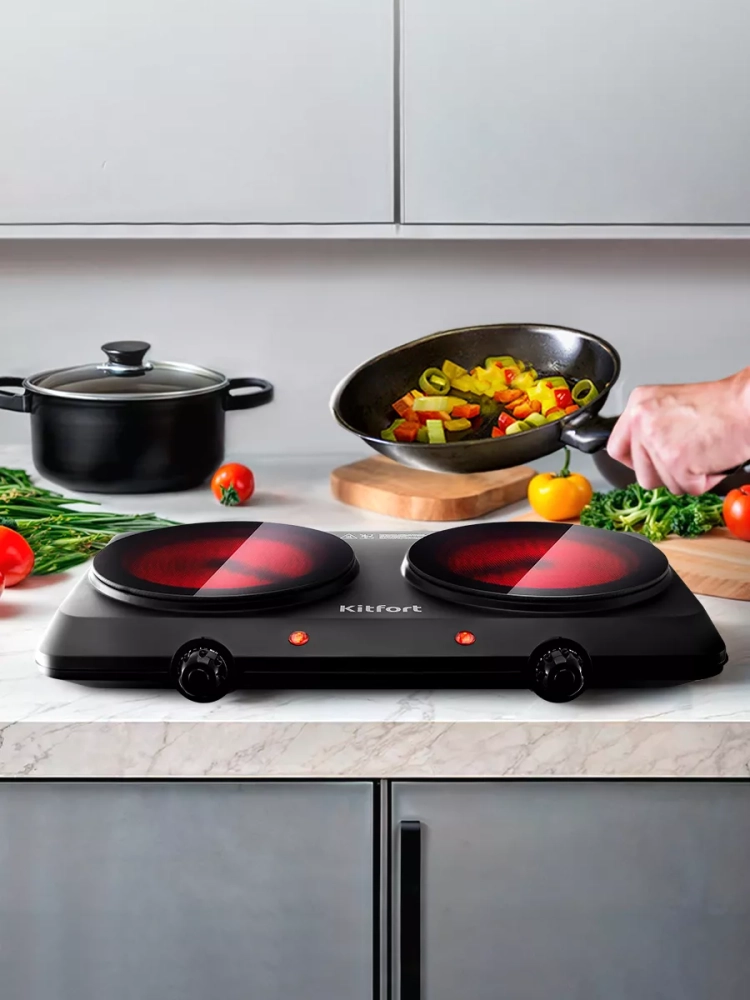 Эта настольная плита идеально подходит для использования в условиях ограниченного пространства, обеспечивая максимальную функциональность и удобство. Электрическая плита Kitfort — это надежный выбор для вашей кухни, который сочетает в себе качество, стиль и инновации.