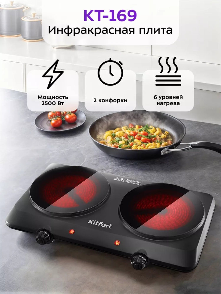Электрическая инфракрасная плита Kitfort КТ-169 мощностью 2500 Вт — это идеальное решение для вашей кухни. Эта настольная плита сочетает в себе передовые технологии и стильный дизайн, что делает её незаменимой в любом кухонном пространстве. Электроплита оснащена двумя конфорками, которые обеспечивают равномерное распределение тепла, что позволяет готовить блюда быстро и эффективно.