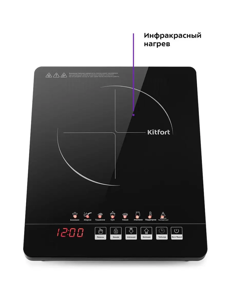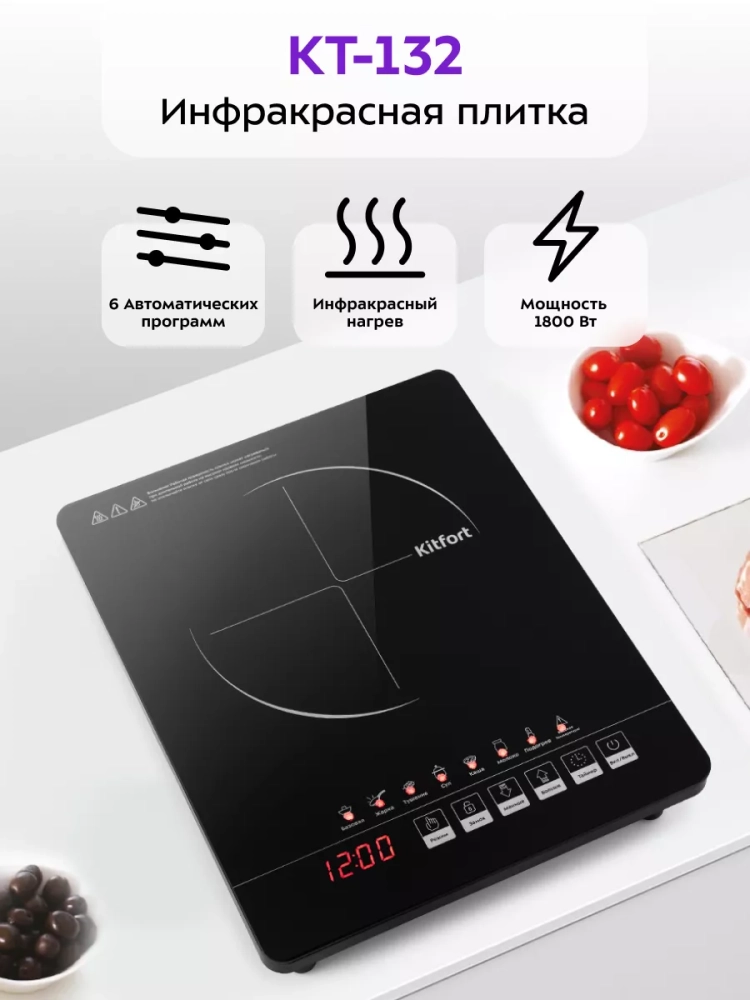 Инфракрасная плитка Китфорт КТ-132 представляет собой один из новых экологически чистых кухонных приборов. Плитка Kitfort КТ-132 выполнена в пластиковом корпусе с рабочей поверхностью из стеклокерамики и обладает максимальной мощностью 1800 Вт. На низких уровнях мощности регулировка мощности осуществляется плавнее, чем у обычных плит, ступеней мощности здесь больше. В отличие от индукционных плит инфракрасная плита не имеет импульсного режима. Нагрев происходит постоянно даже на минимальных мощностях. Инфракрасная плитка позволяет легко жарить блины и готовить практически любые блюда на любой посуде, в том числе на тонких алюминиевых сковородах. Инфракрасная плитка поможет сделать жизнь вашей семьи здоровой и принесет чистоту на вашу кухню.