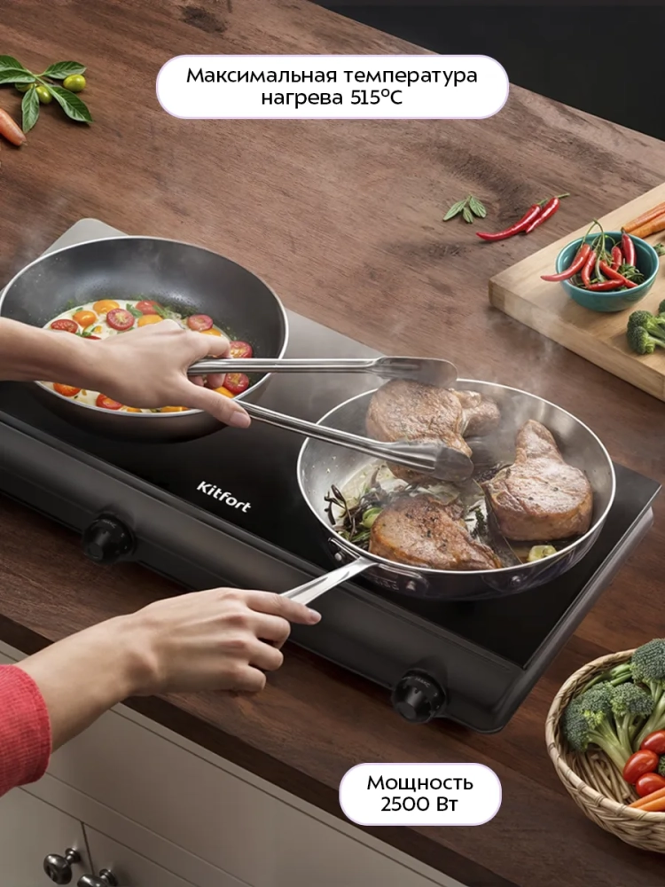 Инфракрасная плита настольная КТ-192 от kitfort — это современная техника, которая станет незаменимым помощником на вашей кухне. Эта электроплита мощностью 2100–2500 Вт выполнена в стильном металлическом корпусе с рабочей поверхностью из стеклокерамики. Плита оснащена инфракрасным излучателем, который обеспечивает равномерное нагревание посуды без прямого контакта с нагревательным элементом, что делает её безопасной и экологичной. Электроплита КТ-192 идеально подходит для приготовления разнообразных блюд на любой посуде, включая тонкие алюминиевые сковороды. Механический термостат позволяет точно контролировать температуру конфорок, исключая необходимость использования вентиляторов и снижая уровень шума во время работы. Инфракрасный излучатель состоит из металлической ленты и способен достигать температуры до 500 °C. Плитка выдерживает перепады напряжения и может работать как при повышенном, так и при пониженном напряжении питания. Однако важно помнить о запрете подключения через тиристорные или импульсные регуляторы напряжения во избежание поломки устройства. Для оптимальной передачи тепла рекомендуется использовать посуду с плоским дном. Электрическая плитка одноконфорочная — это отличный выбор для тех, кто ценит удобство и функциональность в домашней обстановке. Кухонный электро прибор от китфорт не только практичен в использовании дома, но также добавляет стиль вашему интерьеру благодаря своему современному дизайну.