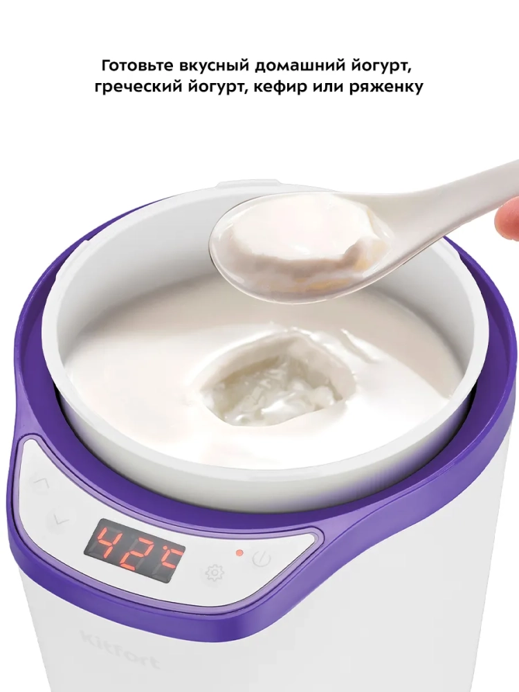 Йогуртница Kitfort КТ-2077 — это идеальная техника для приготовления домашнего йогурта. С помощью этой йогуртницы вы сможете легко приготовить вкусный и полезный продукт, используя закваску и молоко. В комплект входят два контейнера емкостью 1,8 литра и 1,6 литра с крышками, что позволяет хранить готовый йогурт с пробиотиками в холодильнике. Благодаря ситу можно приготовить греческий йогурт или творог. Эта модель оснащена таймером и шестью предустановленными программами, а также одной программой с возможностью установки времени приготовления от 1 до 99 часов и температуры от 25 до 65 градусов Цельсия. Йогуртница равномерно нагревает смесь ингредиентов, поддерживая заданную температуру для оптимального результата. Греческий йогурт отличается своей густой текстурой благодаря отделению сыворотки. Он содержит меньше сахара и больше белка по сравнению с обычным йогуртом, что делает его более питательным вариантом для вашего рациона. Приготовление в Kitfort КТ-2077 очень просто: смешайте молоко с закваской "наринэ" или другой пробиотической смесью в контейнере, установите его в приборе, выберите программу или настройте время и температуру вручную — всё остальное сделает техника за вас! После завершения процесса прибор автоматически отключится. Йогуртница Китфорт — это не только удобство использования благодаря продуманной конструкции крышки и вместительным контейнерам на несколько литров каждый; она также обеспечивает равномерное распределение тепла внутри устройства для достижения наилучших результатов при приготовлении различных кисломолочных продуктов.