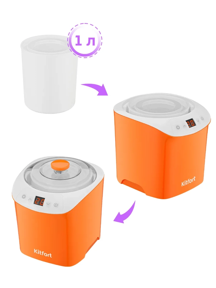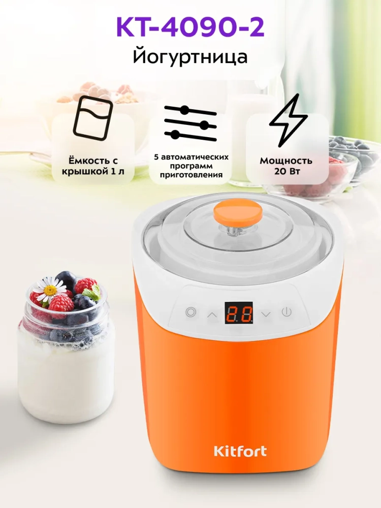 Йогуртница Kitfort КТ-4090 предназначена для приготовления вкусного и полезного домашнего йогурта. Прибор укомплектован пластиковой банкой на 1 литр с крышкой, в котором готовый йогурт можно хранить в холодильнике. Йогуртница равномерно нагревает банку с ингредиентами, поддерживая заданную температуру.