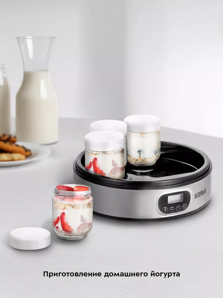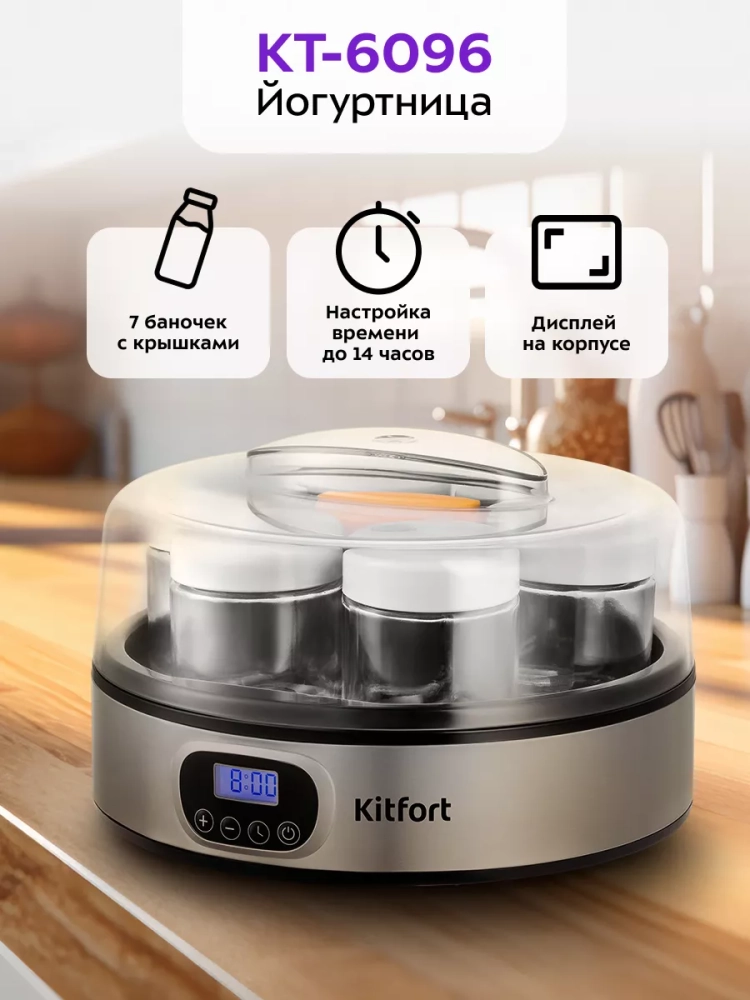 Йогуртница Kitfort КТ-6096 предназначена для приготовления вкусного и полезного домашнего йогурта. Прибор укомплектован 7 стеклянными баночками по 200 мл каждая, в которых готовый йогурт можно хранить в холодильнике. Йогуртница равномерно нагревает баночки с ингредиентами, поддерживая заданную температуру.