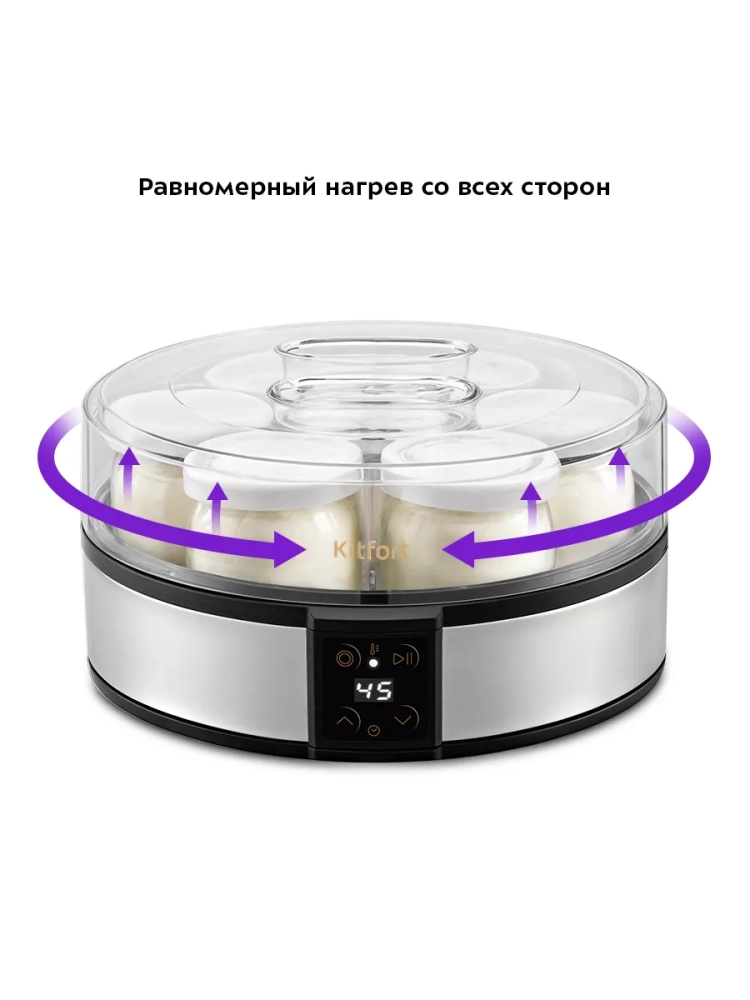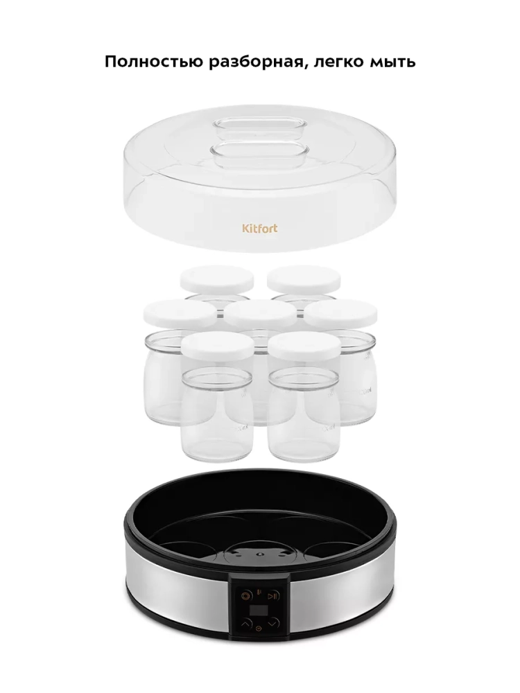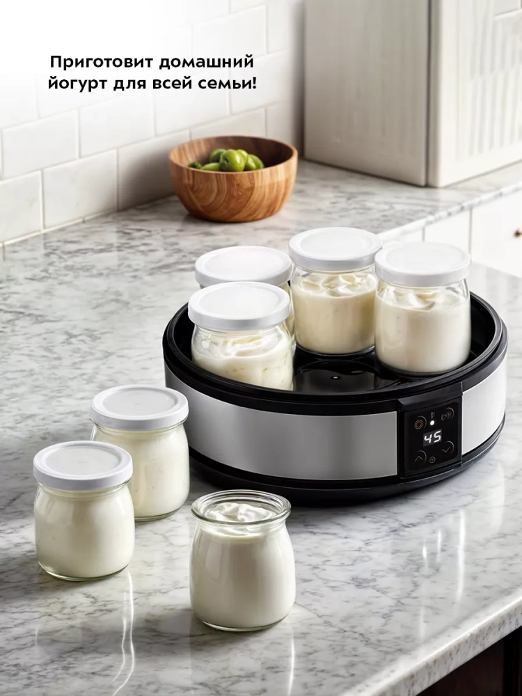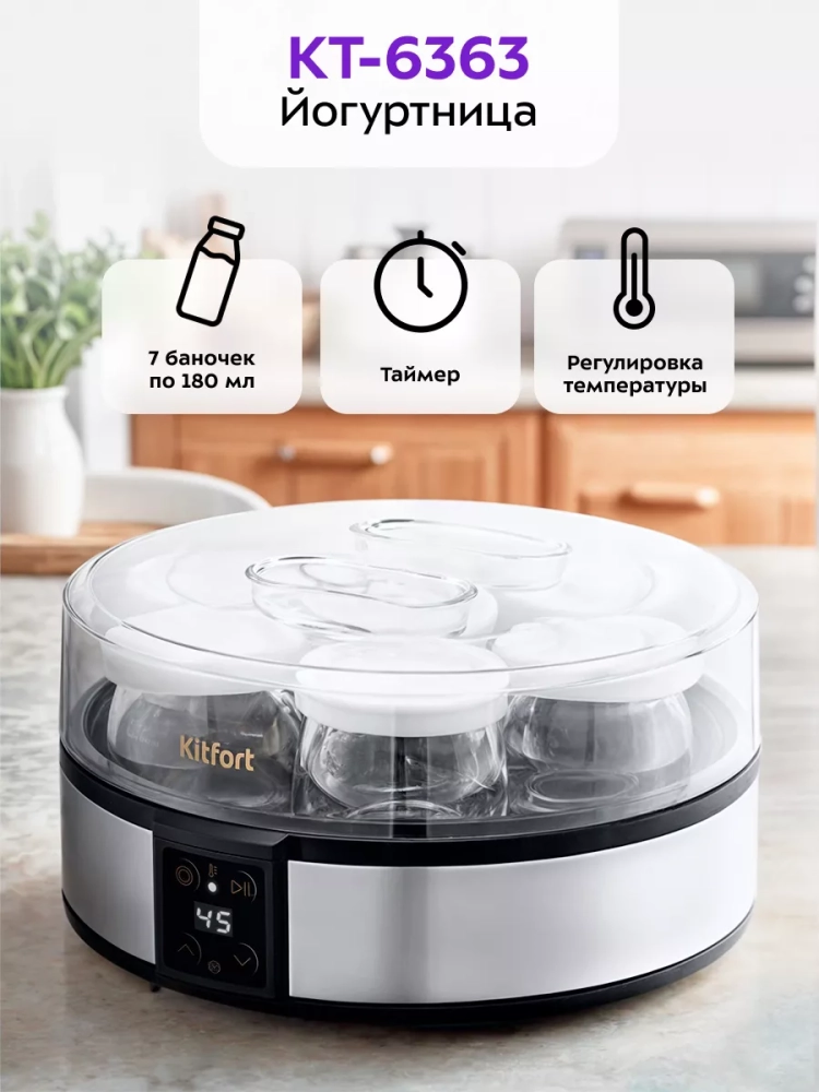 Йогуртница Kitfort КТ-6363 — это идеальный прибор для приготовления вкусного и полезного домашнего йогурта. Этот прибор оснащен 7 стеклянными баночками по 190 мл, что позволяет удобно хранить готовый йогурт в холодильнике. Йогуртница равномерно нагревает баночки с ингредиентами, поддерживая оптимальную температуру для закваски. Приготовление йогурта с этой техникой очень просто: смешайте молоко и закваску, разлейте смесь по баночкам и установите их в йогуртницу. Затем включите прибор и выставьте таймер на нужное время. Соблюдая рекомендации по приготовлению, вы получите замечательный вкусный продукт. Йогурт усваивается лучше других молочных продуктов благодаря живым бактериальным культурам, которые помогают организму усваивать минералы и витамины. Он насыщает организм кальцием больше, чем само молоко, укрепляя кости и зубы. Потребление йогурта улучшает работу кишечника за счет здоровой микрофлоры. Электрическая техника Kitfort КТ-6363 не только помогает готовить натуральный йогурт дома, но также позволяет экспериментировать с другими продуктами на основе молока или даже без него! Баночка из стекла обеспечивает безопасное хранение продукта без потери его свойств. Крышка каждой банки плотно закрывается для надежного хранения содержимого в холодильнике или другом месте вашего дома. Благодаря компактному дизайну эта техника легко впишется в интерьер любой кухни. С помощью этого прибора можно приготовить разнообразные продукты: от классического йогурта до более сложных рецептов на основе различных заквасок.