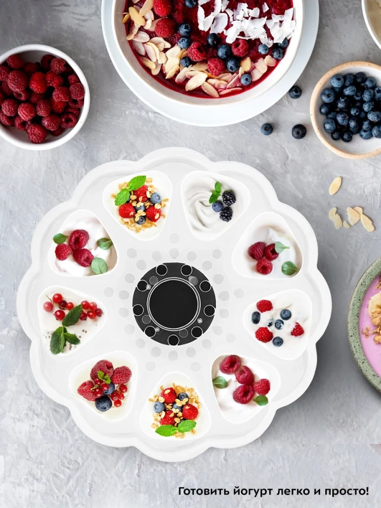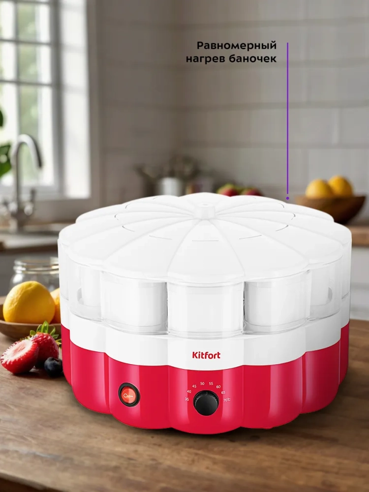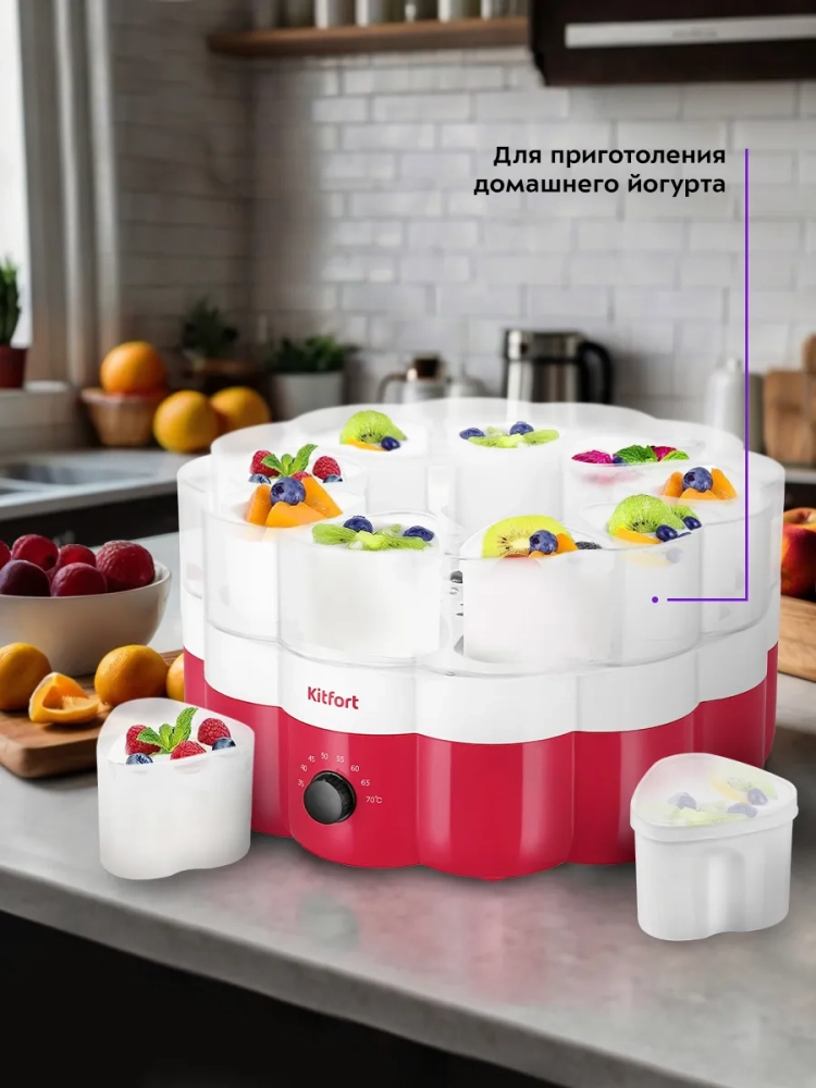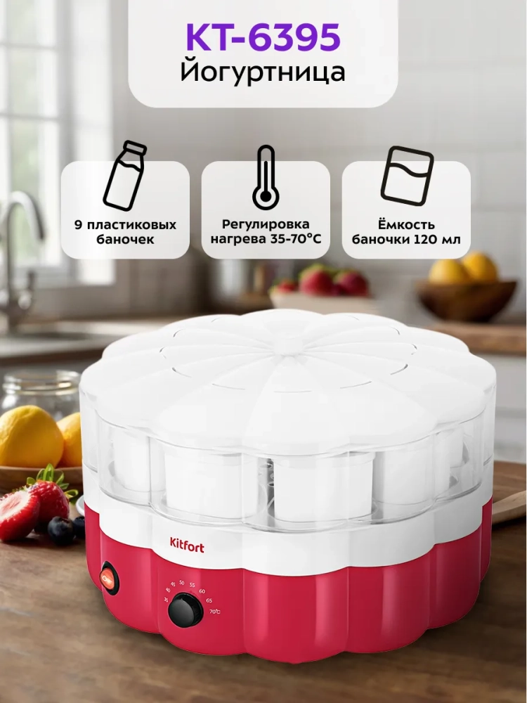Йогуртница Kitfort КТ-6395 предназначена для приготовления вкусного и полезного домашнего йогурта. Прибор укомплектован 9 пластиковыми баночками емкостью 120 мл каждая. Готовый йогурт можно хранить в холодильнике прямо в баночках. Йогуртница равномерно нагревает баночки с ингредиентами, поддерживая необходимую температуру.