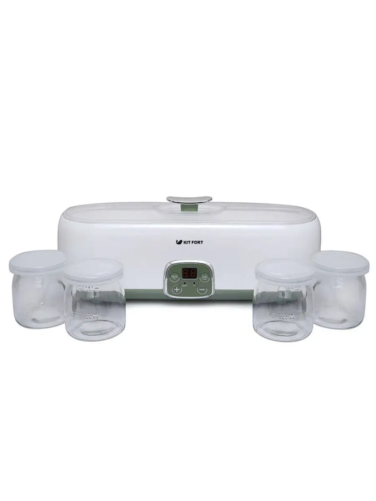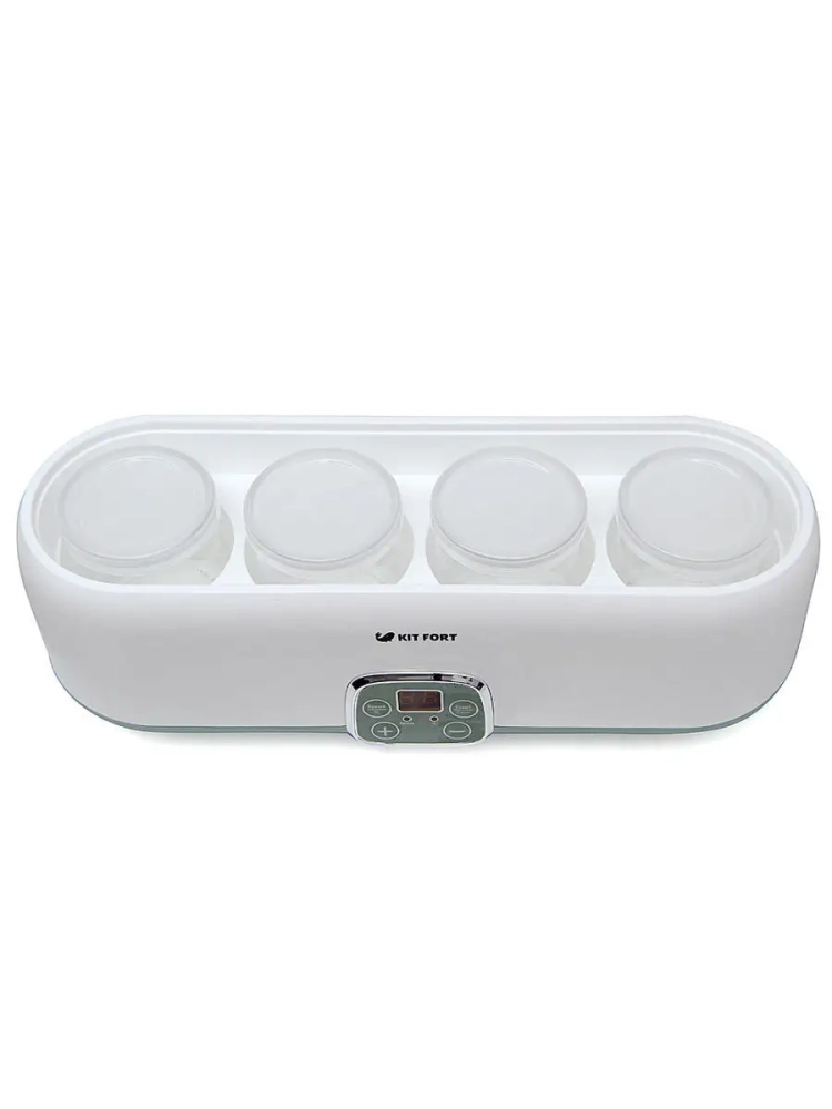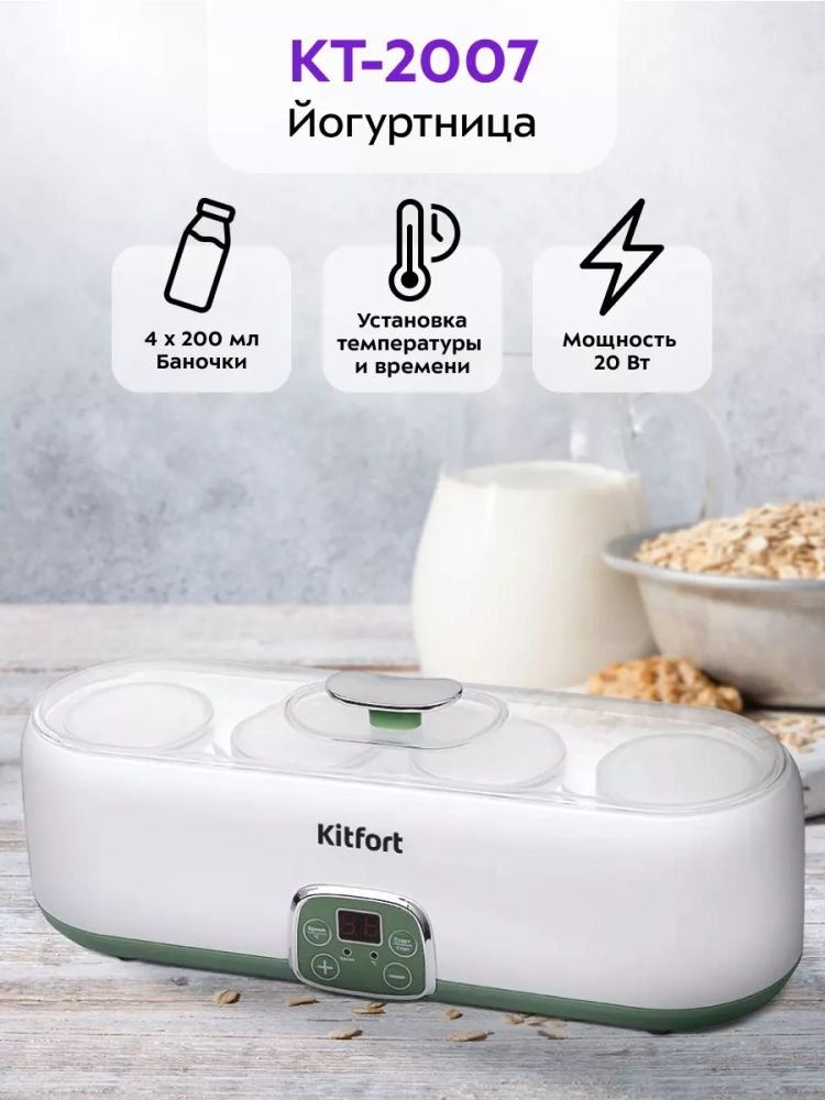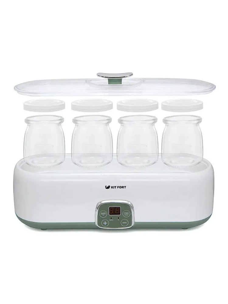 Йогуртница Kitfort КТ-2007 с электронным управлением предназначена для приготовления вкусного и полезного домашнего йогурта. Она имеет компактную овальную форму и вмещает 4 стеклянные баночки, в которых готовый йогурт можно хранить в холодильнике. Йогуртница Китфорт равномерно нагревает баночки с ингредиентами, поддерживая заданную температуру.