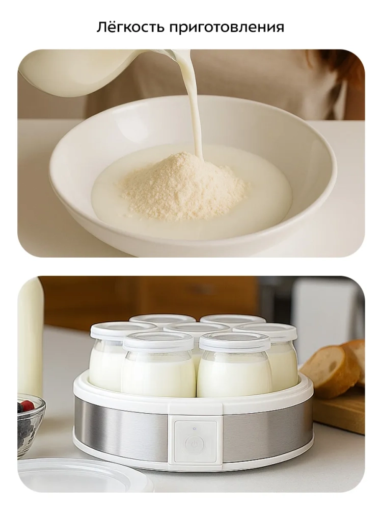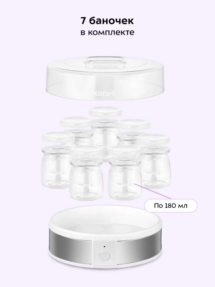 Йогуртница Kitfort КТ-6405 предназначена для приготовления вкусного и полезного домашнего йогурта. В комплекте есть 7 пластиковых баночек емкостью 180 мл каждая. Готовый йогурт можно хранить в холодильнике прямо в баночках. Йогуртница равномерно нагревает баночки с ингредиентами, поддерживая необходимую температуру.