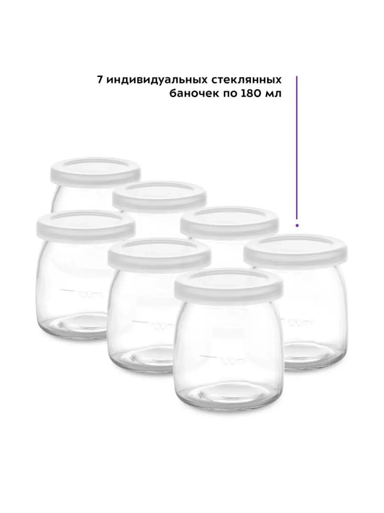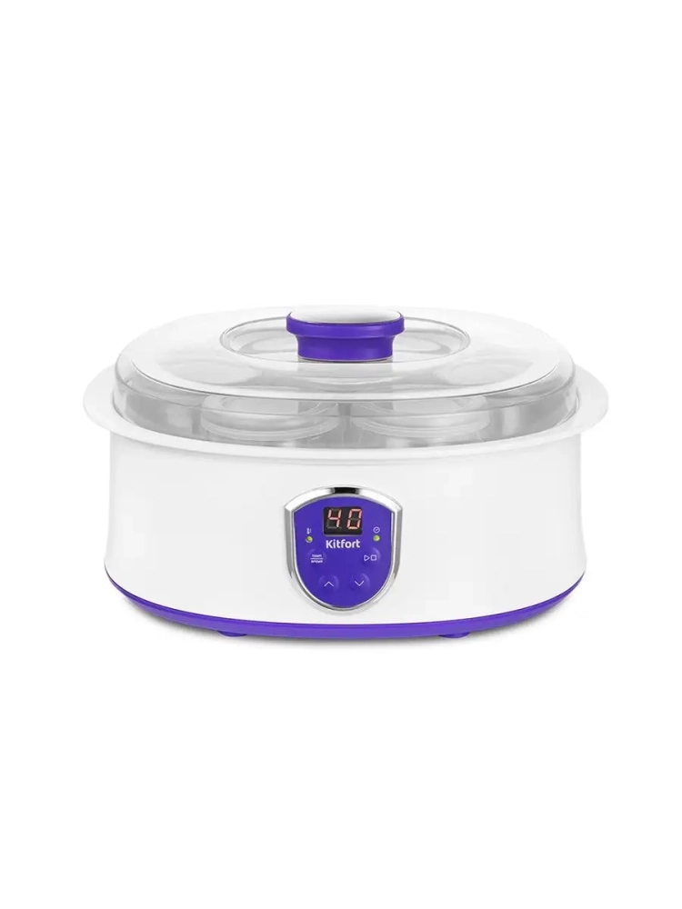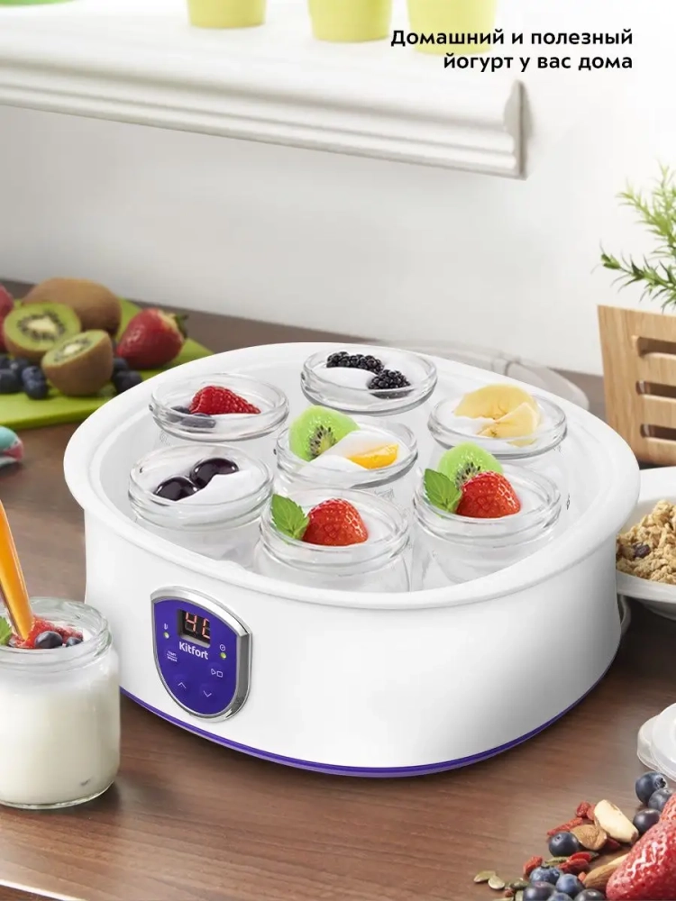Электрическая йогуртница с таймером и баночками KT-2088 от Kitfort — ваш надежный помощник в создании вкусного и полезного домашнего йогурта. Эта модель, оснащенная электронным управлением, позволяет легко приготовить натуральный кисломолочный продукт. В комплект входят 7 стеклянных баночек по 180 мл каждая, что делает процесс приготовления удобным и практичным. Готовый йогурт можно хранить в холодильнике благодаря плотно закрывающимся крышкам. Йогуртница равномерно нагревает баночки с ингредиентами, поддерживая оптимальную температуру для достижения наилучшего результата. Панель управления позволяет установить время и температуру приготовления, а светодиодный дисплей отображает текущие настройки. Звуковой сигнал таймера известит вас о завершении процесса. Создавайте натуральные кисломолочные продукты с высоким содержанием витаминов и минералов: кальция, калия и магния. Потребление такого йогурта улучшает работу кишечника благодаря живой микрофлоре, включая бифидумбактерин, которая препятствует проникновению вредных веществ в кровь. Натуральный йогурт из банок из прочного стекла насыщает организм молочными белками больше чем молоко: всего два стакана содержат пятую часть суточной нормы белка взрослого человека. Йогурты усваиваются лучше других молочных продуктов благодаря наличию бактериальных культур — это особенно важно для людей с непереносимостью лактозы или аллергией на белки молока. Крышка каждой баночки обеспечивает сохранность продукта при транспортировке или хранении в холодильнике. С помощью этой йогуртницы от Китфорт вы сможете ежедневно наслаждаться свежим домашним кисломолочным продуктом без лишних усилий.