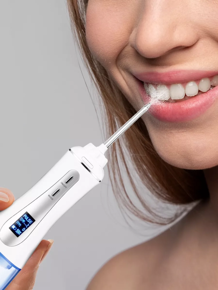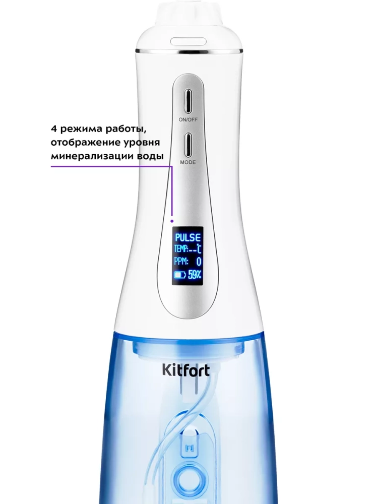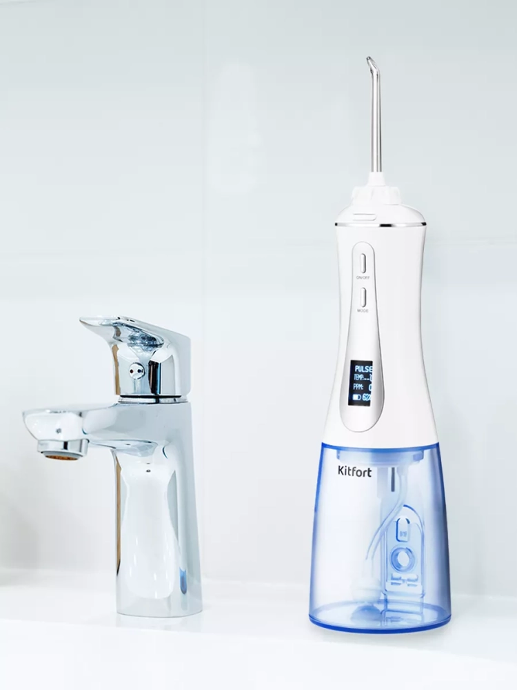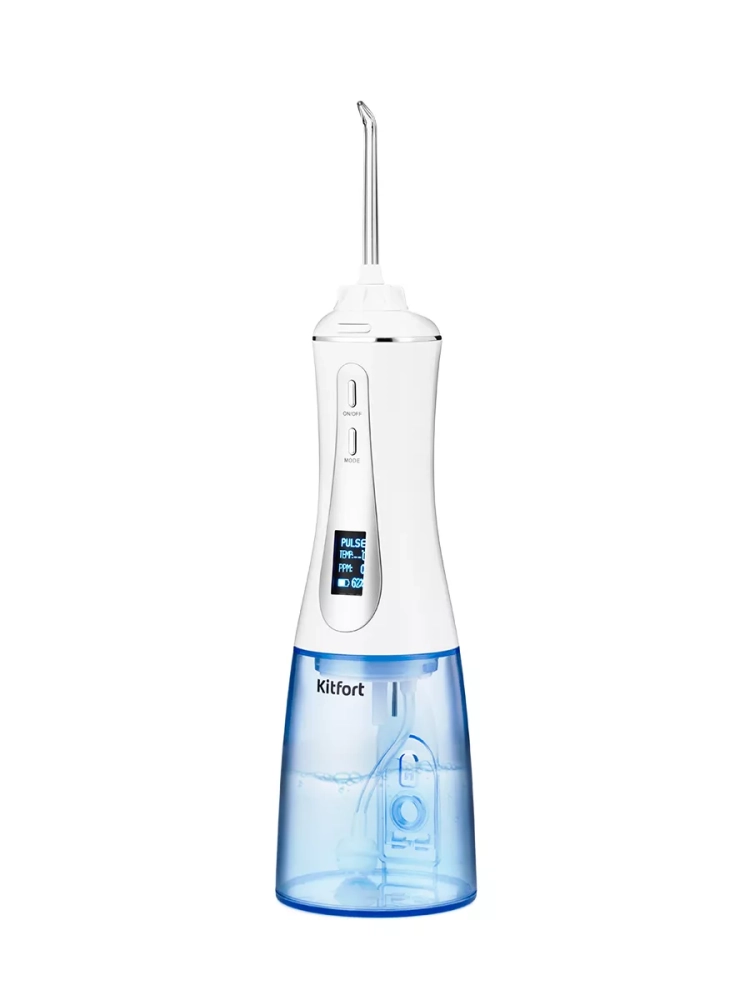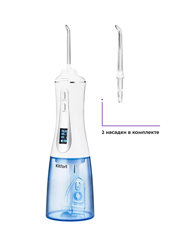 Модель Kitfort KT-2913 является портативным ирригатором, его можно брать с собой в путешествия или на работу - он с легкостью поместится в небольшой сумке.У ирригатора 5 режимов работы - Soft (мягкий), Normal (нормальный), Strong (сильный), Pulse (импульсный режим) и Child (детский). Если вы до этого не пользовались ирригатором, начните с режима Soft или Child, т.к. неподготовленные и чувствительные десны могут начать кровоточить из-за сильного и тонкого потока воды. Когда десны привыкнут и окрепнут, вы можете переходить на другие режимы.При работе на дисплее у ирригатора отображаются название режима, температуру воды, уровень минерализации, а также заряд батареи. Прибор автоматически отключается после 2 минут использования.В комплекте к ирригатору идут две классические струйные насадки, например, для двух членов семьи. На насадках есть специальные цветные уплотнительные пластиковые части, чтобы насадки нельзя было перепутать.