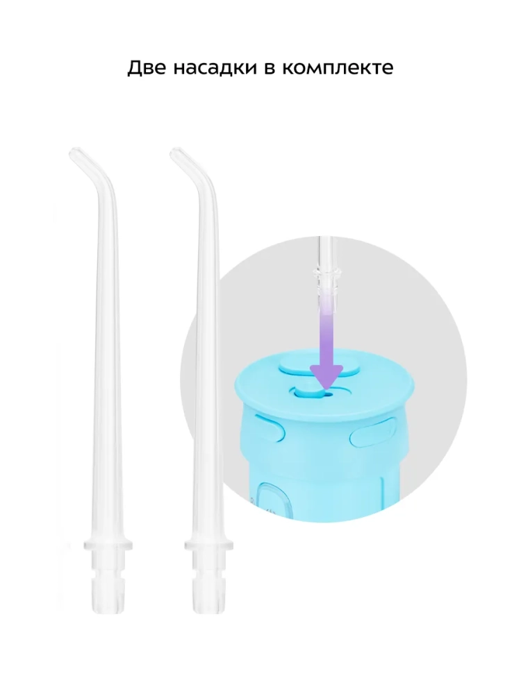 У ирригатора есть резервуар для воды емкостью 175 мл, которого хватает для тщательной обработки полости рта. В комплекте к ирригатору идет две классических струйных насадки.