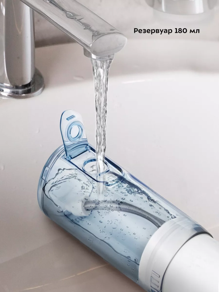 У ирригатора есть резервуар для воды емкостью 180 мл, которого хватает для тщательной обработки полости рта.