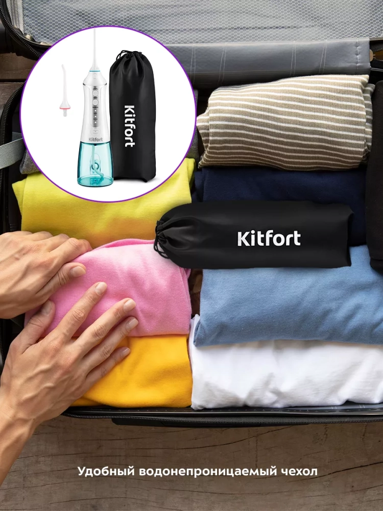 Модель Kitfort KT-2902 является портативным ирригатором, его можно брать с собой в путешествия или на работу — он с легкостью поместится в небольшой сумке. Сам ирригатор вы можете положить в чехол из водонепроницаемой ткани, он идет в комплекте.
