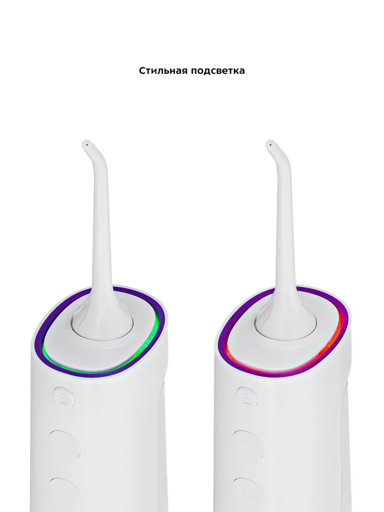 Данная модель ирригатора имеет защиту от случайного включения. Кнопку включения надо нажать и удерживать несколько секунд, тогда прибор включится. При работе у ирригатора светится подсветка уровня заряда батареи. По цветам подсветки можно определять уровень заряда.