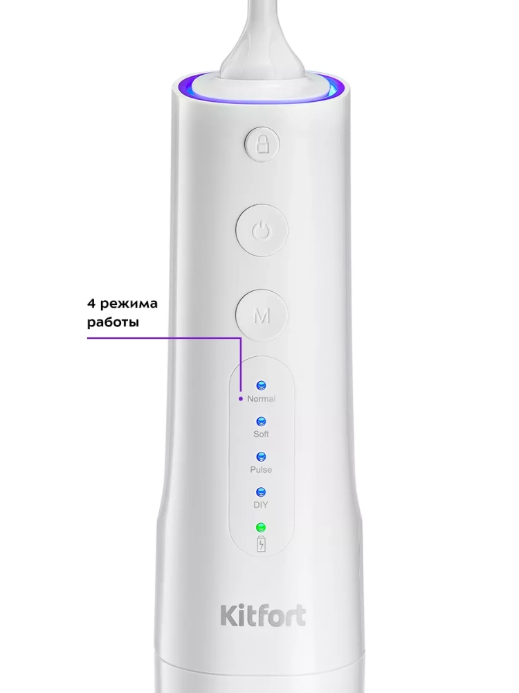 У ирригатора 4 режима работы — «Normal» (нормальный), «Soft» (мягкий), «Pulse» (импульсный режим) и «DIY» (ручной).