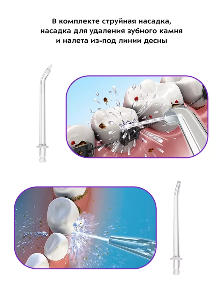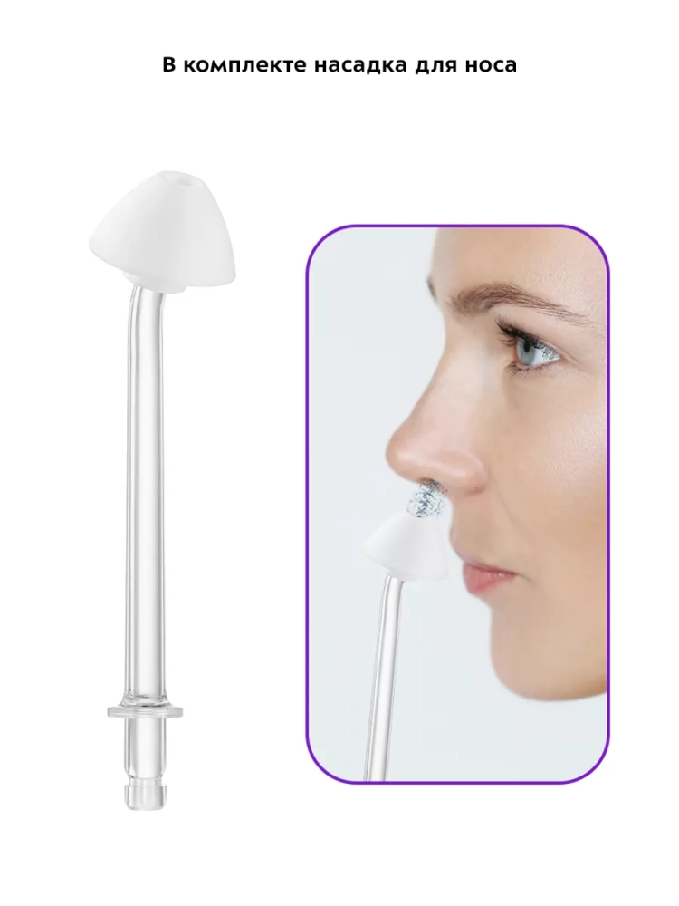 В комплекте к ирригатору идут насадки: классическая струйная, для удаления зубного камня и налета из-под линии десны и для носа.