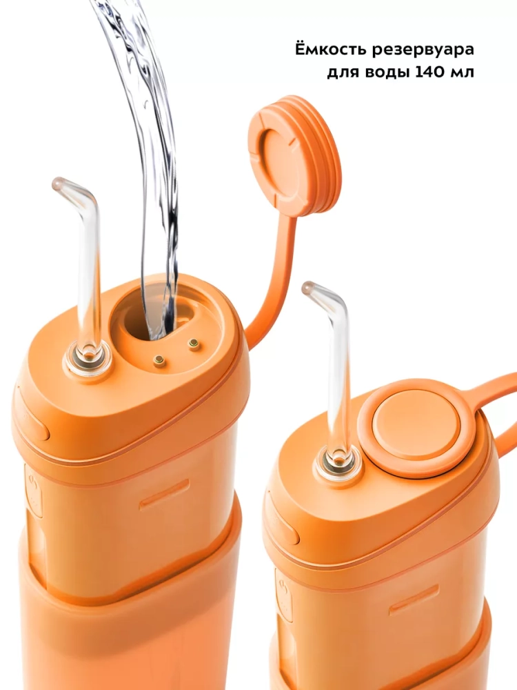 У ирригатора есть резервуар для воды емкостью 140 мл. Для компактного хранения и удобной транспортировки устройство имеет складную конструкцию: ирригатор сдвигается в резервуар для воды.