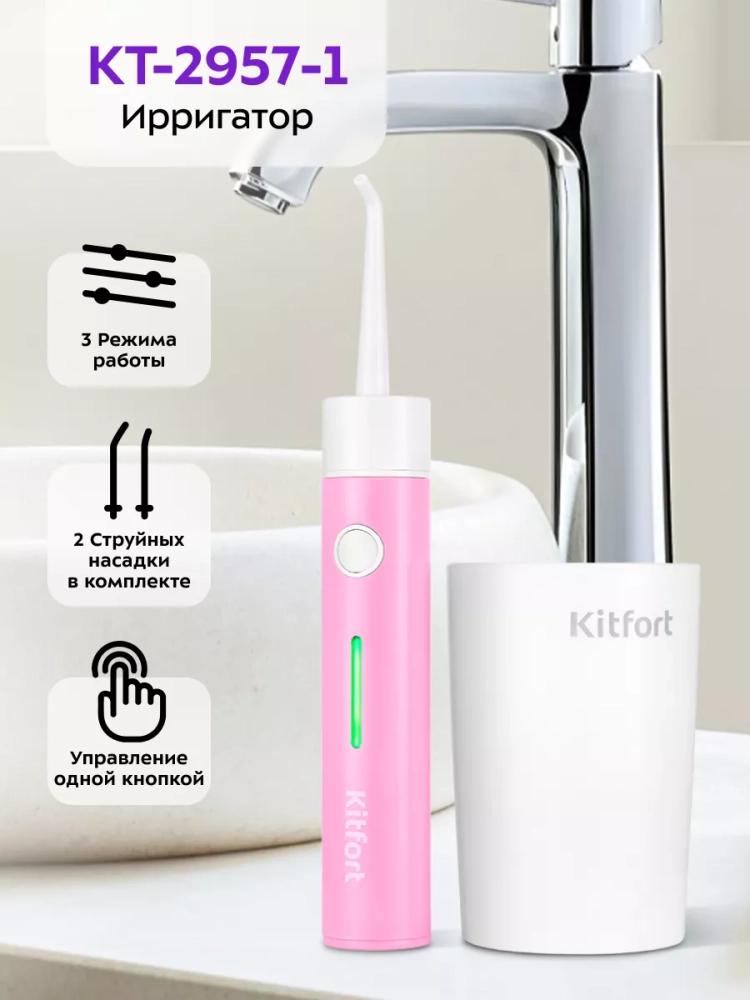 Ирригатор Kitfort KT-2957 — важное вспомогательное устройство для поддержания гигиены полости рта. Он позволяет справиться с налетом и остатками пищи в труднодоступных местах, например, межзубном пространстве и пародонтальных карманах.