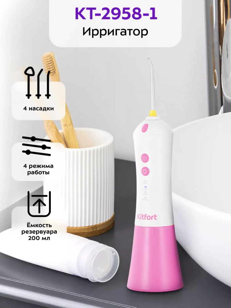 Ирригатор Kitfort KT-2958 — важное вспомогательное устройство для поддержания гигиены полости рта. Он позволяет справиться с налетом и остатками пищи в труднодоступных местах, например, межзубном пространстве и пародонтальных карманах.
