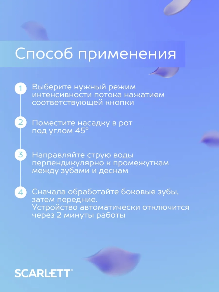 Ирригатор Scarlett – это стильный предмет интерьера, который гармонично вписывается в вашу ванную комнату. Мы знаем, как важна эстетика, поэтому каждый элемент дизайна продуман до мелочей. Минималистичный современный стиль делают ирригатор для зубов не просто исключительным инструментом для ухода, но и истинным украшением вашего пространства.