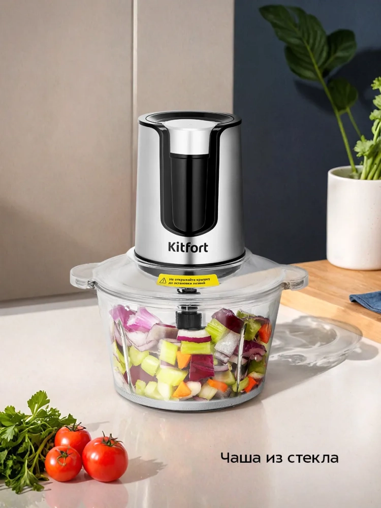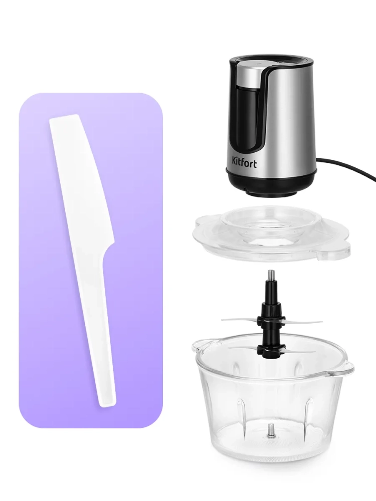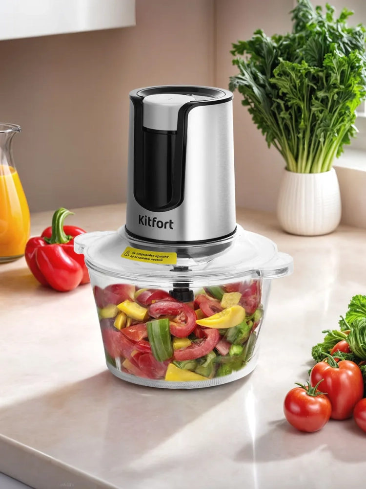 Измельчитель «3 в 1» Kitfort КТ-3515 — устройство для быстрого измельчения мяса, твердого сыра, овощей, трав, чеснока, ягод и многих других продуктов. Два блока двойных ножей измельчают ингредиенты практически по всей высоте чаши. Процесс измельчения пищи происходит намного быстрее, чем при использовании ручных кухонных приспособлений. Любой салат будет готов за считанные минуты. Все что потребуется — подготовить продукты для резки и следить за степенью измельчения. В комплекте также есть насадка для взбивания и насадка для чеснока.
