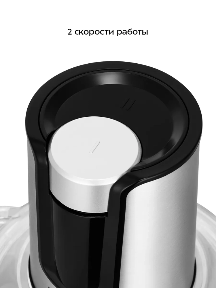 Управление прибором осуществляется с помощью двух кнопок, расположенных в верхней части моторного блока. У измельчителя есть две скорости работы. Первая скорость подходит для измельчения более мягких продуктов, вторая скорость — для более твердых и плотных. Степень измельчения продуктов регулируется длительностью нажатия на кнопку выбранной скорости.