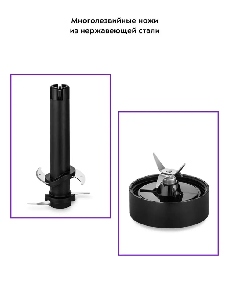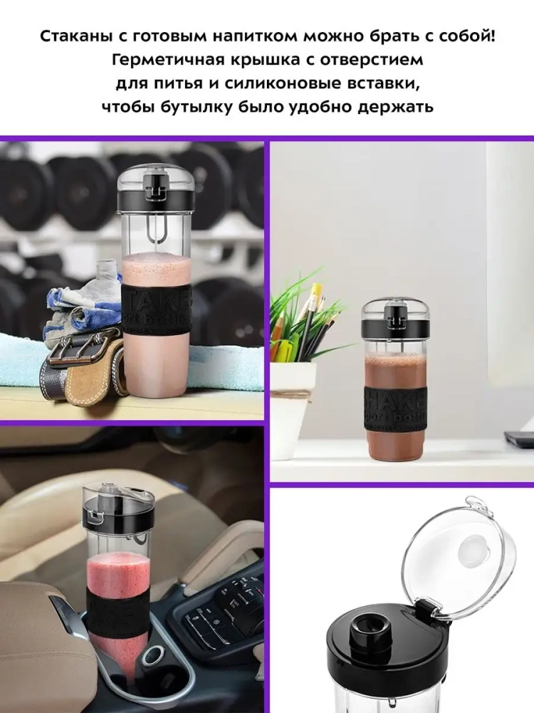 Также в комплекте идет блендер с двумя портативными бутылками емкостью 570 и 400 мл и блок ножей для использования функции Shake & Take, которая позволяет готовить протеиновые смеси и фитнес-напитки. После приготовления напитка бутылку можно закрыть навинчивающейся крышкой, после чего она превращается в удобный контейнер для хранения и переноски приготовленной смеси. Вы можете поместить бутылку в холодильник или взять с собой в спортзал. Бутылка влезает в подстаканник автомобиля. На крышке есть ручка для переноски и отверстие для питья через трубочку, закрываемое силиконовой заглушкой. На корпусе бутылок есть специальная силиконовая накладка, чтобы бутылки было удобно держать.