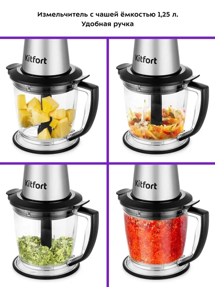 Чаша измельчителя выполнена из прозрачного пластика, что дает возможность наблюдать за процессом и контролировать степень измельчения. Чашу можно закрыть крышкой и использовать для хранения продуктов в холодильнике.