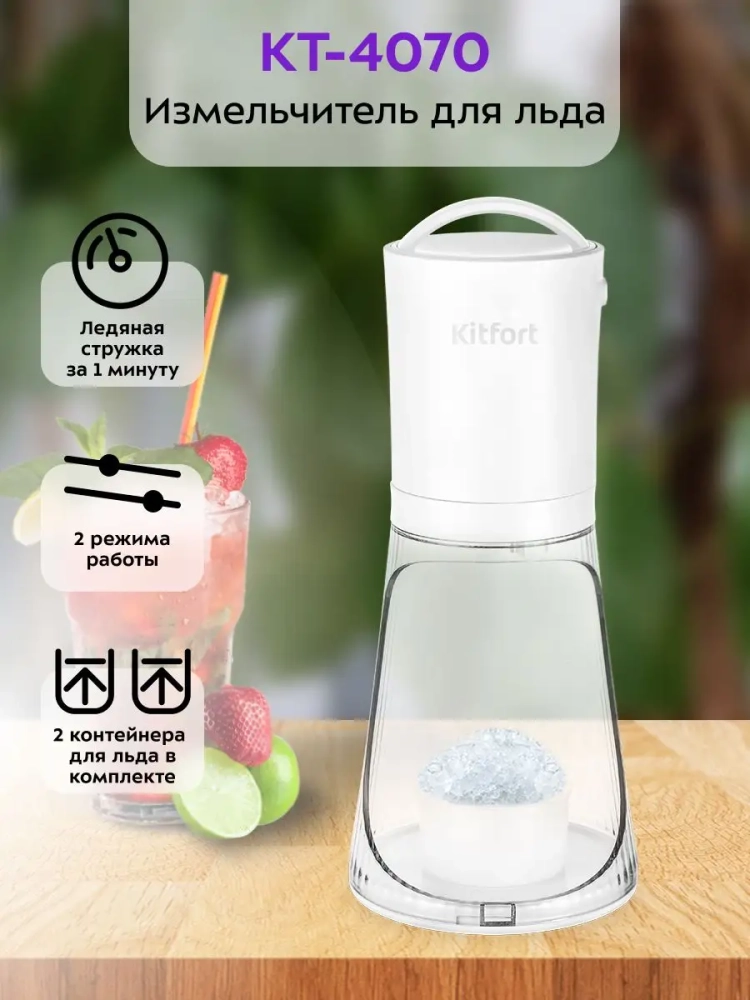 Измельчитель для льда Kitfort КТ-4070 предназначен для измельчения ледяной массы в ледяную стружку. Два режима работы позволяют получать стружку разного размера. В измельчитель можно загружать формованный лед (кубиковый или пальчиковый), а также ледяную шайбу, для изготовления которой в комплекте устройства предусмотрено 2 специальных контейнера для заморозки льда.