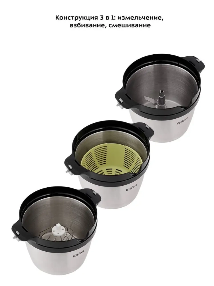 Измельчитель Kitfort КТ-1396 быстро измельчает мясо, твердый сыр, овощи, травы, чеснок, ягоды и многое другое. Двойной нож измельчает продукты практически по всей высоте чаши.