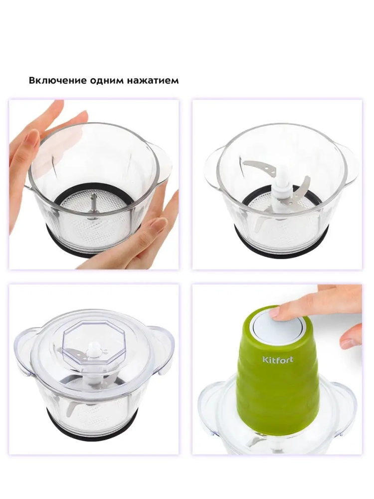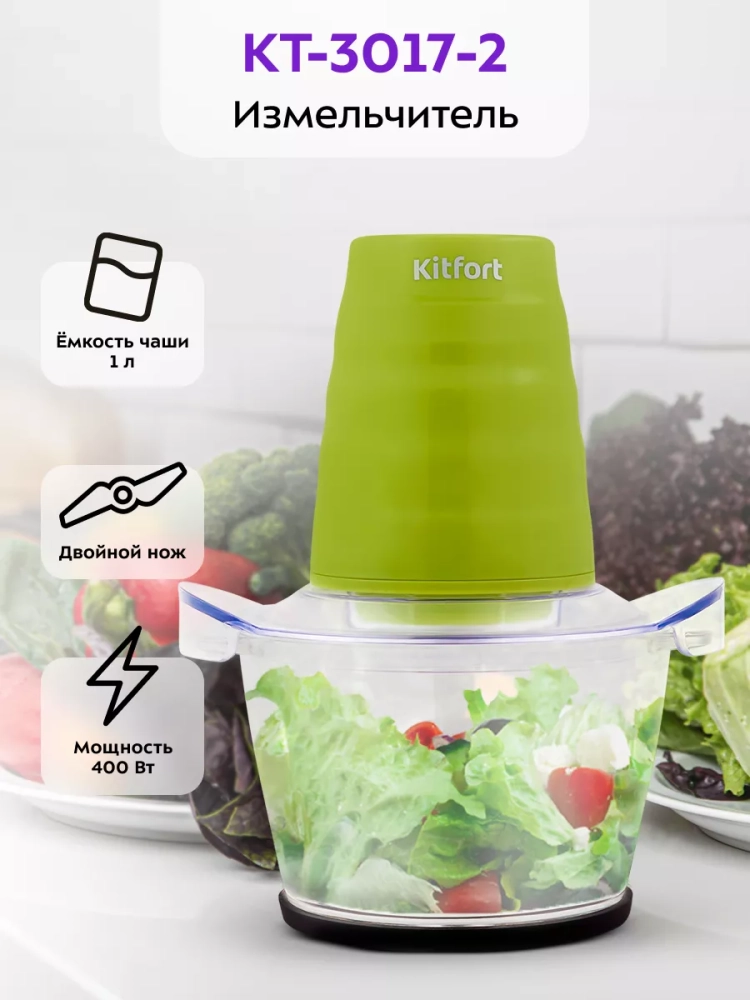 Измельчитель Kitfort КТ-3017 быстро измельчает мясо, твердый сыр, овощи, травы, чеснок, ягоды и многое другое. Двойной нож измельчает продукты практически по всей высоте чаши. Чаша измельчителя сделана из экологически чистого материала - стекла. Чашу можно закрыть крышкой и использовать для хранения продуктов. Для обеспечения безопасности КТ-3017 может работать только с установленным моторным блоком. В комплекте к измельчителю идут защитные кожухи для ножей. Благодаря резиновой подкладке под чашу измельчитель меньше скользит по столу, а также дополнительно снижается вибрация и уровень шума при работе. Управление прибором осуществляется нажатием на кнопку сверху моторного блока. Измельчитель очень просто мыть, т.к. нож разборный и все элементы снимаются легко и быстро.