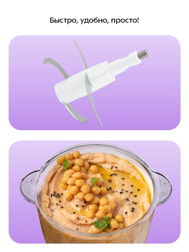 Чаша измельчителя выполнена из стекла, что дает возможность наблюдать за процессом и контролировать степень измельчения. Чашу можно закрыть крышкой и использовать для хранения продуктов в холодильнике. Нескользящая подкладка снизу чаши уменьшает скольжение прибора по столу, а также снижает вибрацию и уровень шума при работе.