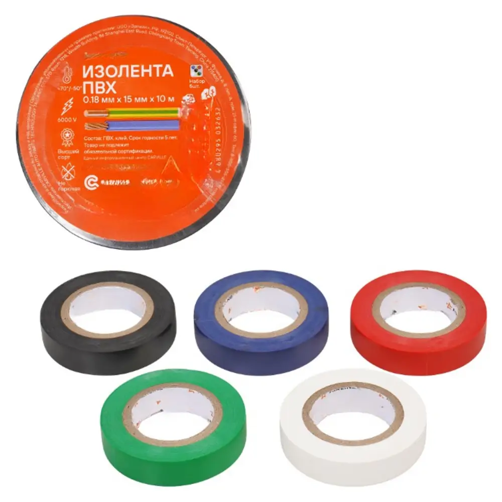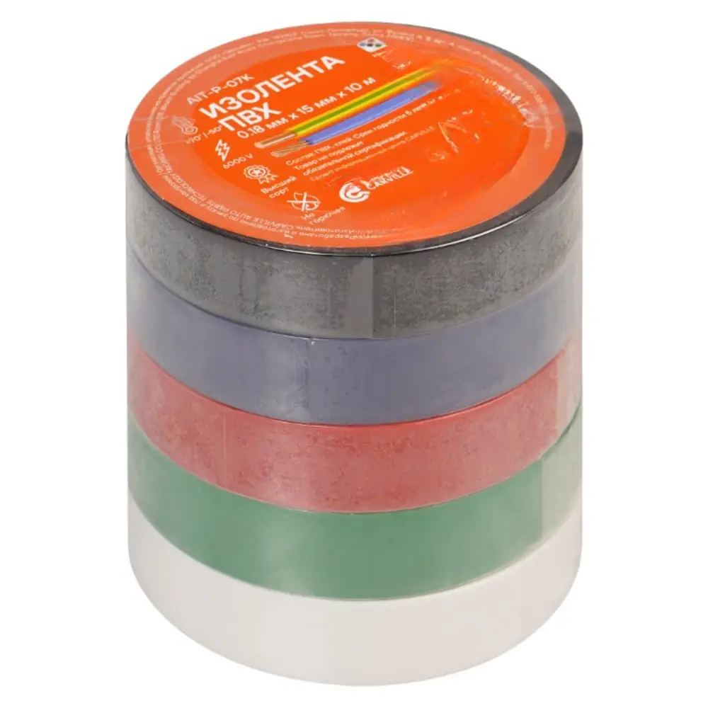 Изолента ПВХ, набор 5 шт.(син.,чёр.,кр.,зел., бел.), 15 мм*10 м