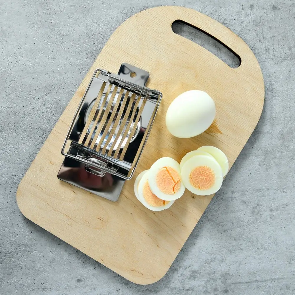 Простая и нужная вещь в хозяйстве – металлическая яйцерезка. Это приспособление мгновенно и ровно разрезает яйца с помощью стальных струн.
