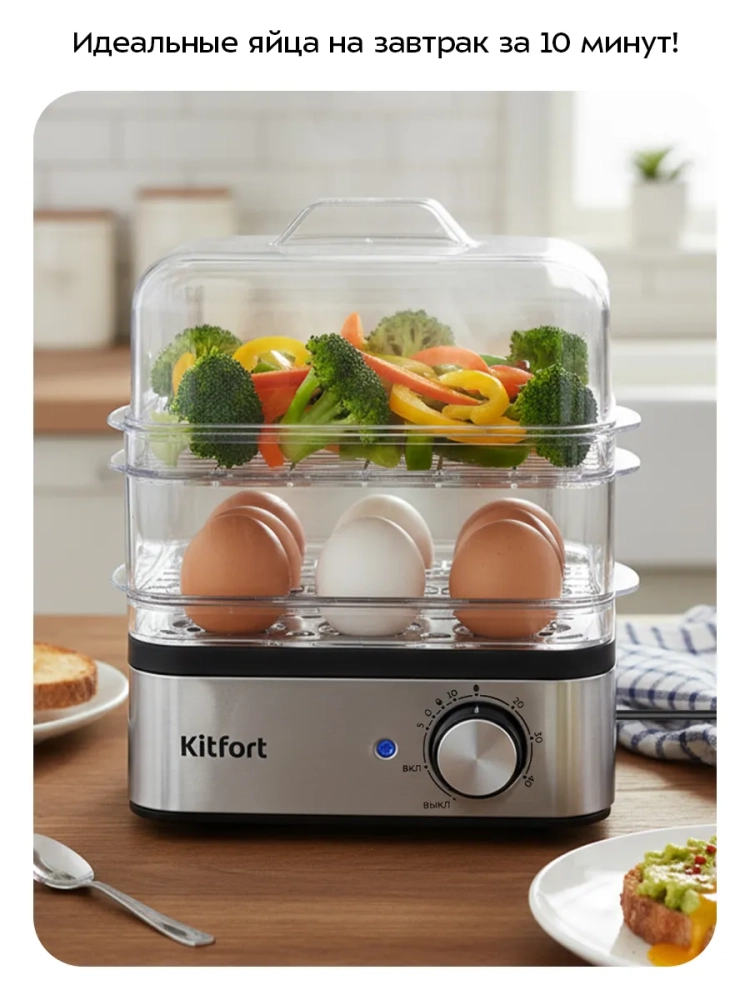 Яйцеварка «2 в 1» Kitfort КТ-6958 совмещает в себе яйцеварку и пароварку, потому что предназначена для варки яиц и других продуктов на пару. Вареные яйца — неотъемлемый элемент вкусного, полезного, а самое главное, простого завтрака. Иногда в утренней спешке не получается аккуратно положить яйца в кастрюлю с водой или вода слишком горячая, и яйца бьются друг о друга. С данным устройством таких проблем не возникнет.